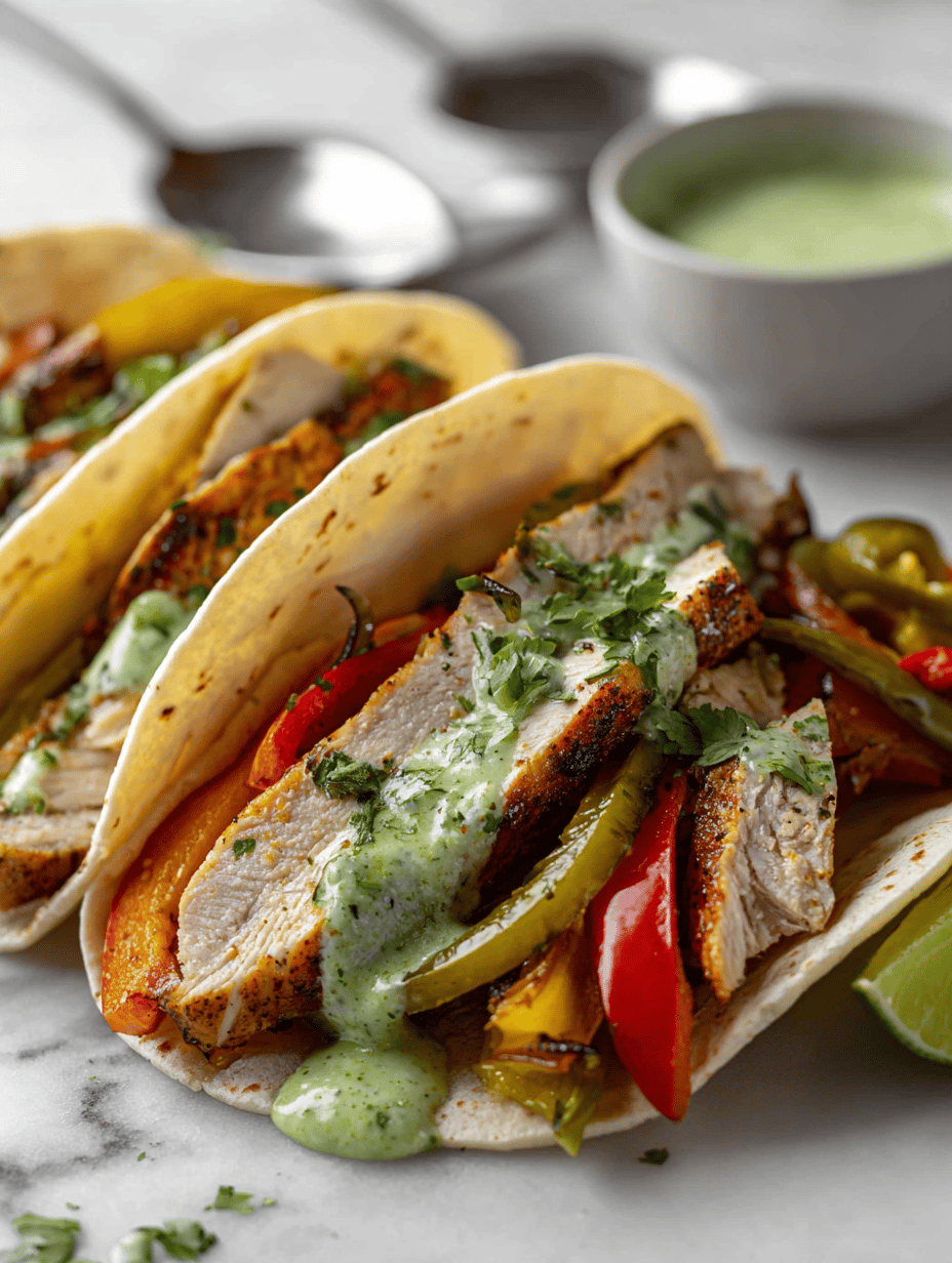 These vibrant chicken tacos feature marinated grilled chicken, smoky charred peppers, and a tangy cilantro lime sauce, all wrapped in warm corn tortillas. The dish combines bold flavors and contrasting textures, creating a satisfying, colorful meal with a fresh finish.