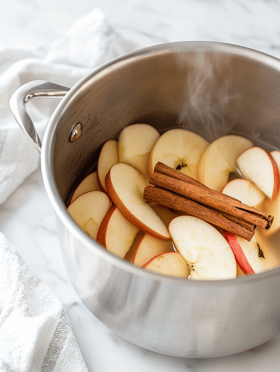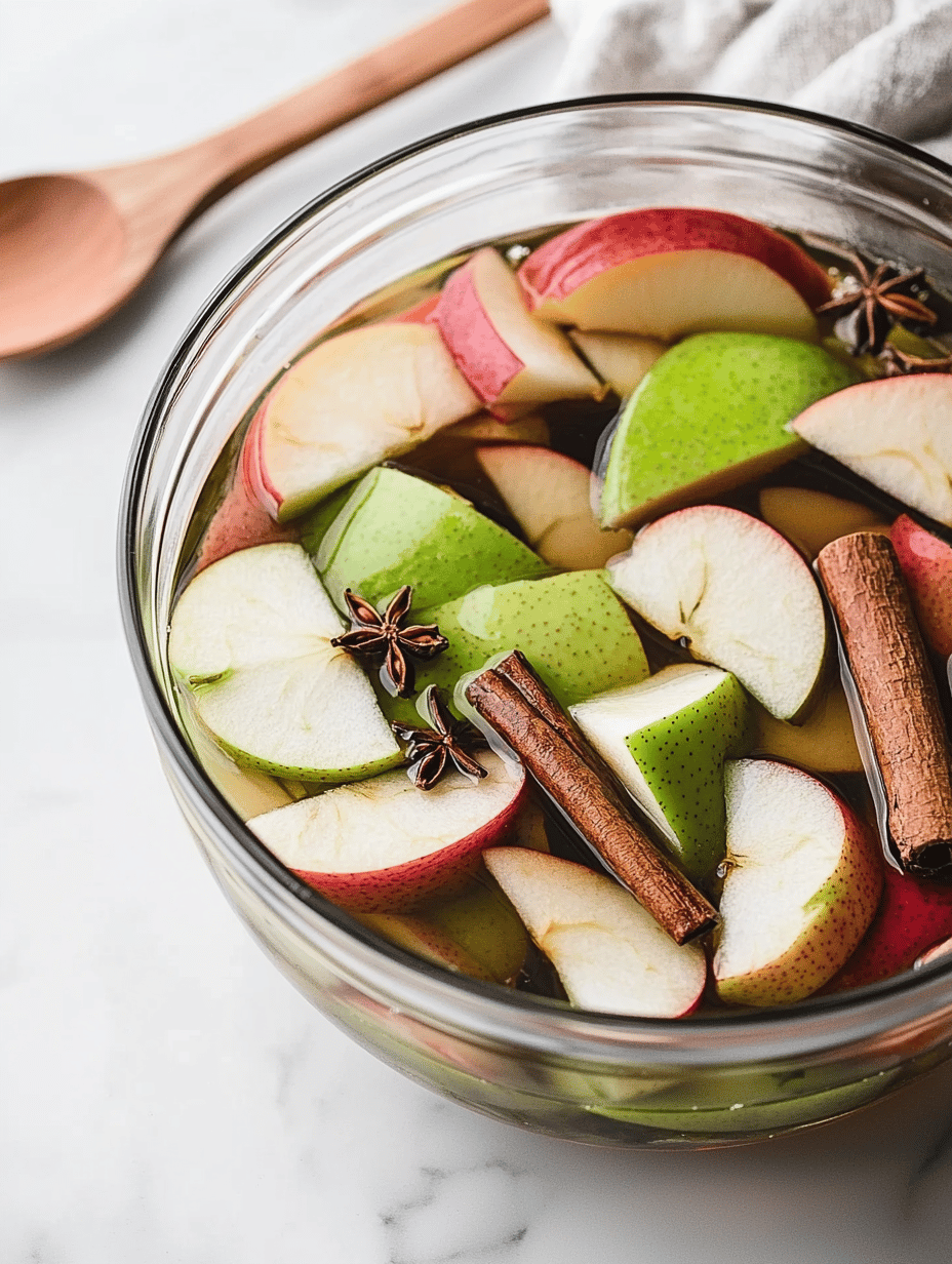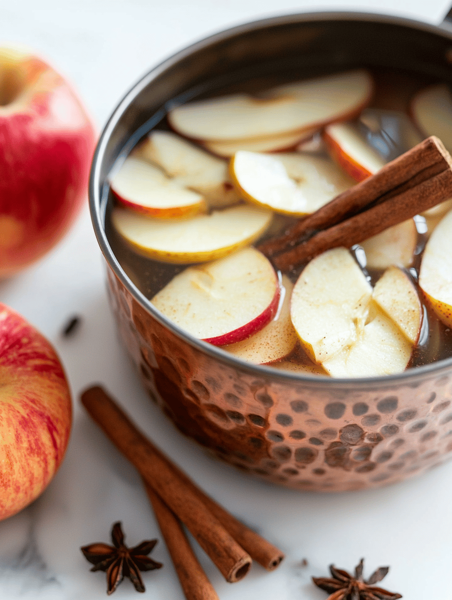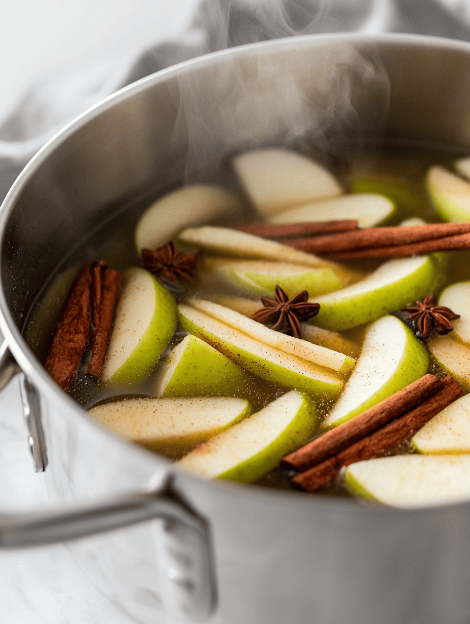 This simmering apple potpourri is a fragrant mixture of whole apples, cinnamon sticks, and spices gently simmered in water. As the apples soften and the spices release their aroma, the mixture creates a warm, spicy fragrance that fills the air with a cozy fall ambiance, with the apples developing a soft, tender texture and a rustic appearance.