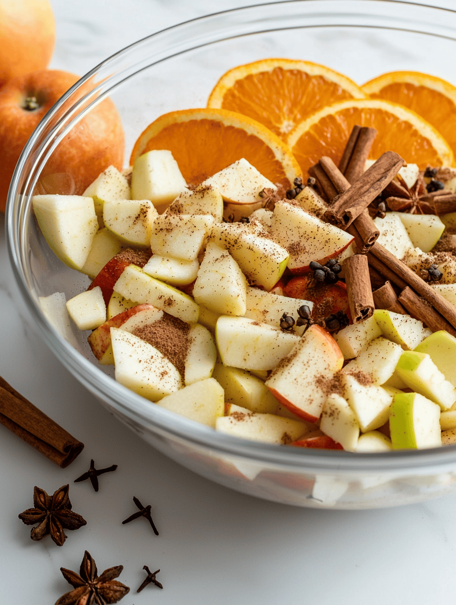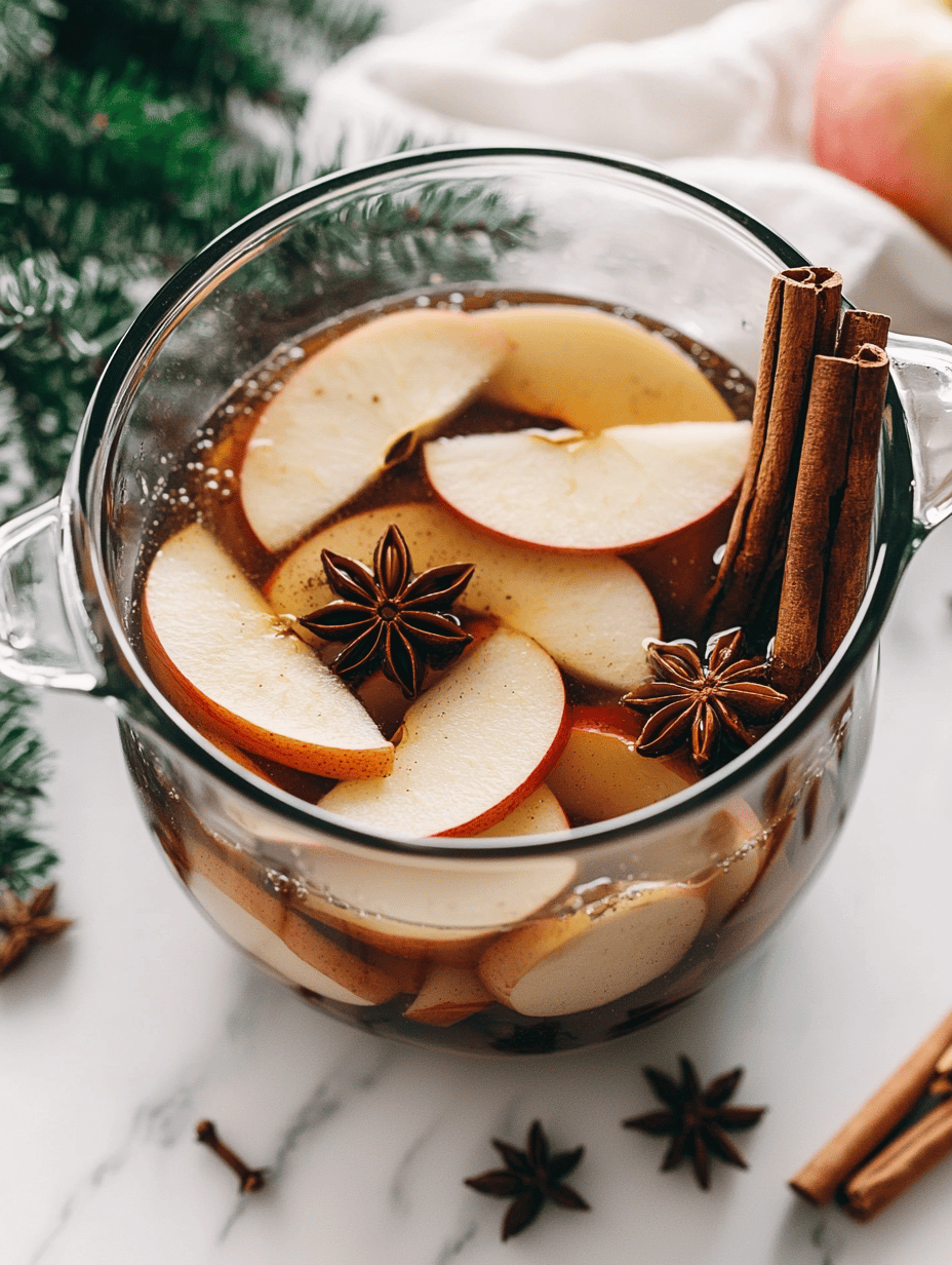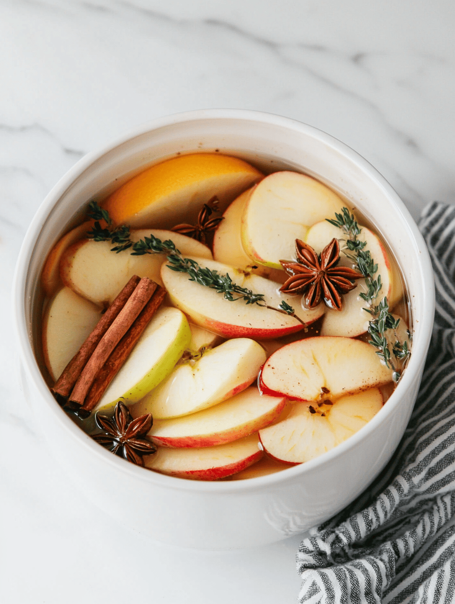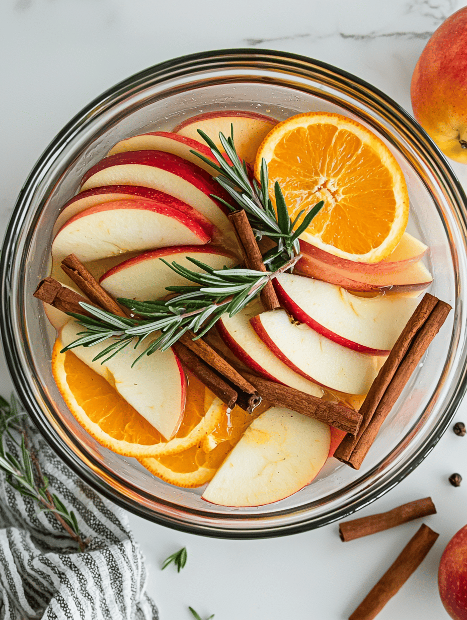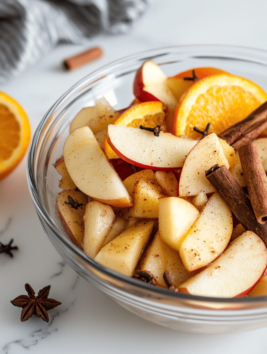This simmering apple potpourri is a fragrant mixture of whole apples, cinnamon sticks, and spices gently simmered in water. As the apples soften and the spices release their aroma, the mixture creates a warm, spicy fragrance that fills the air with a cozy fall ambiance, with the apples developing a soft, tender texture and a rustic appearance.