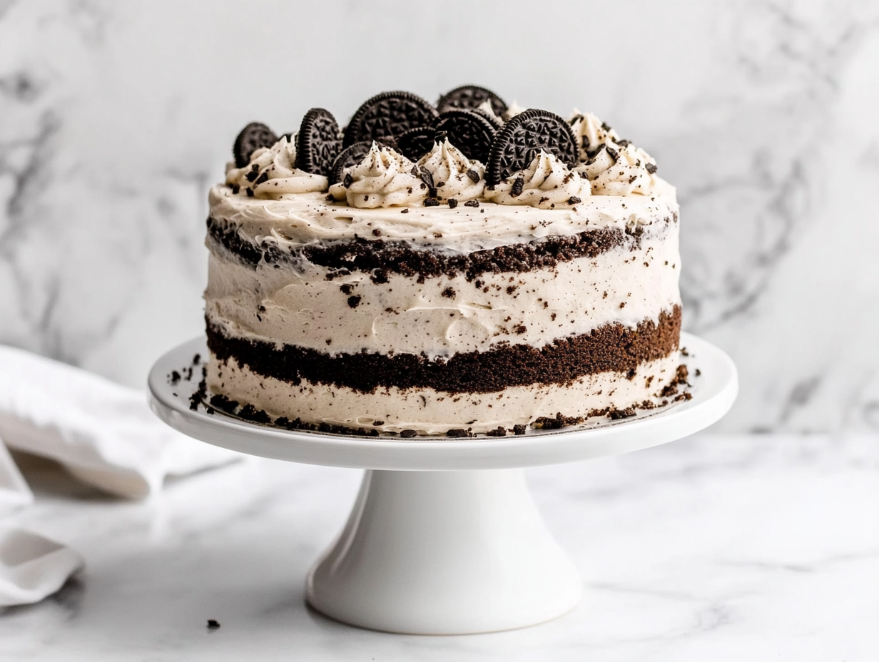 Frost one cooled cake layer generously, place the second layer on top, and cover the entire cake with the Oreo cream frosting.