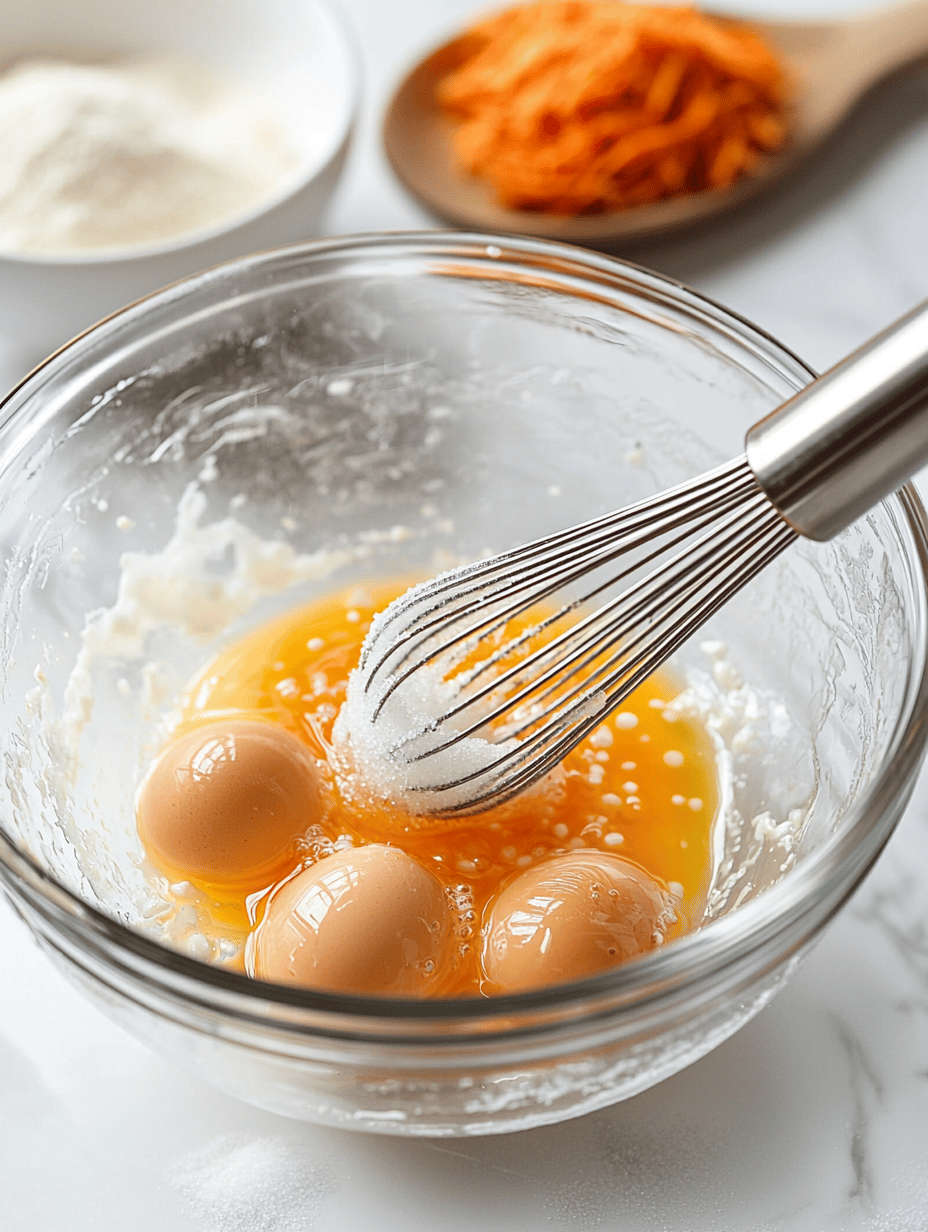 In a large mixing bowl, whisk together the eggs and sugar until the mixture is smooth and slightly frothy—this helps to incorporate air for a tender crumb.