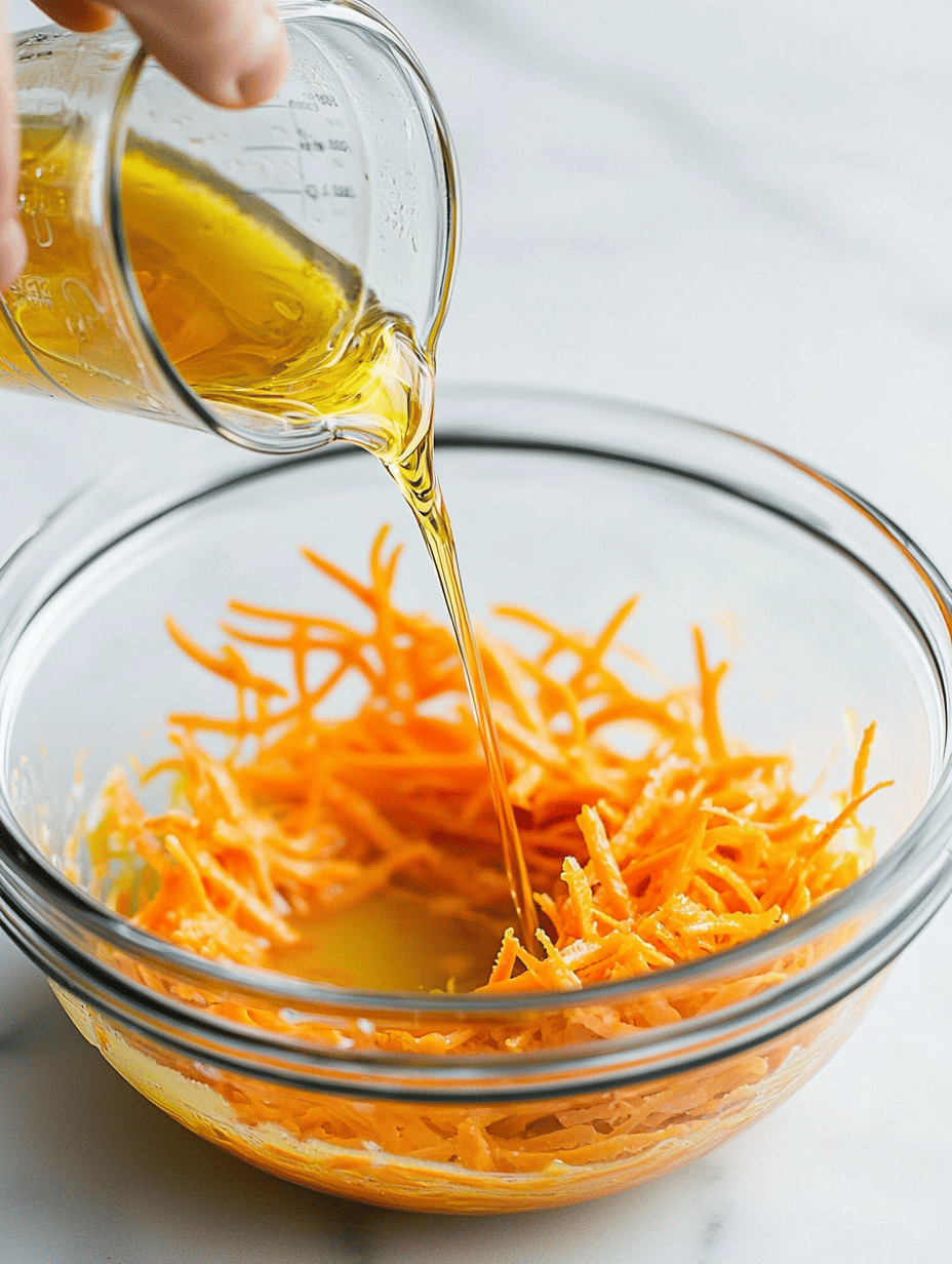 Slowly pour in the oil while whisking, blending everything into a uniform, slightly shiny batter.