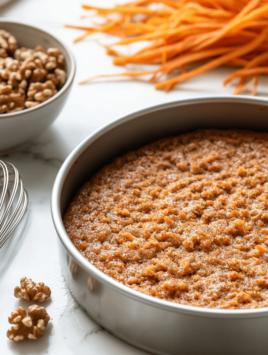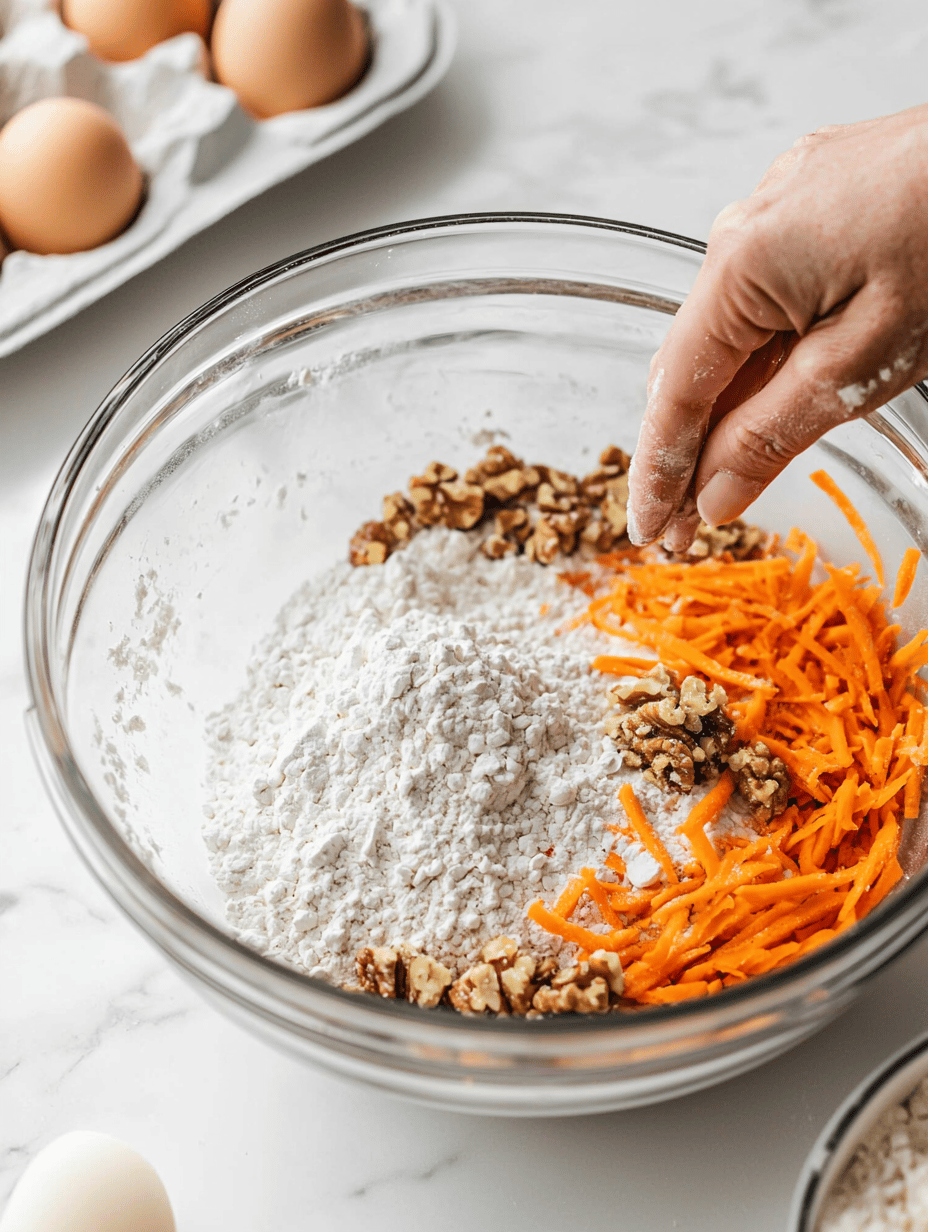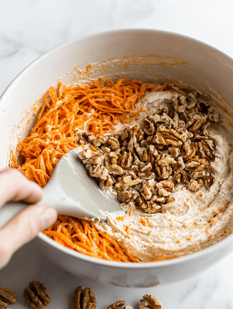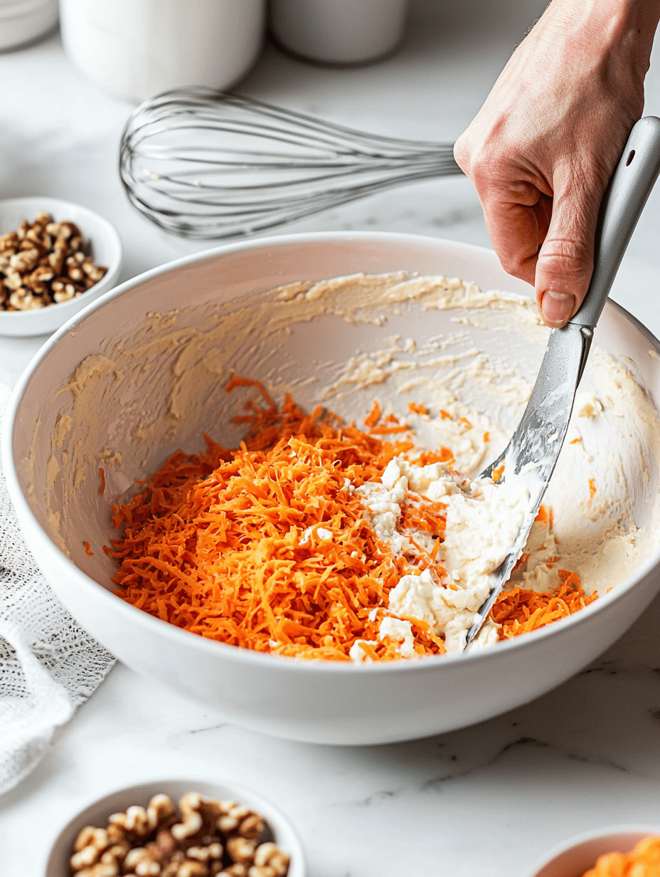 Fold in the grated carrots gently with a spatula, making sure they are evenly distributed without deflating the mixture.