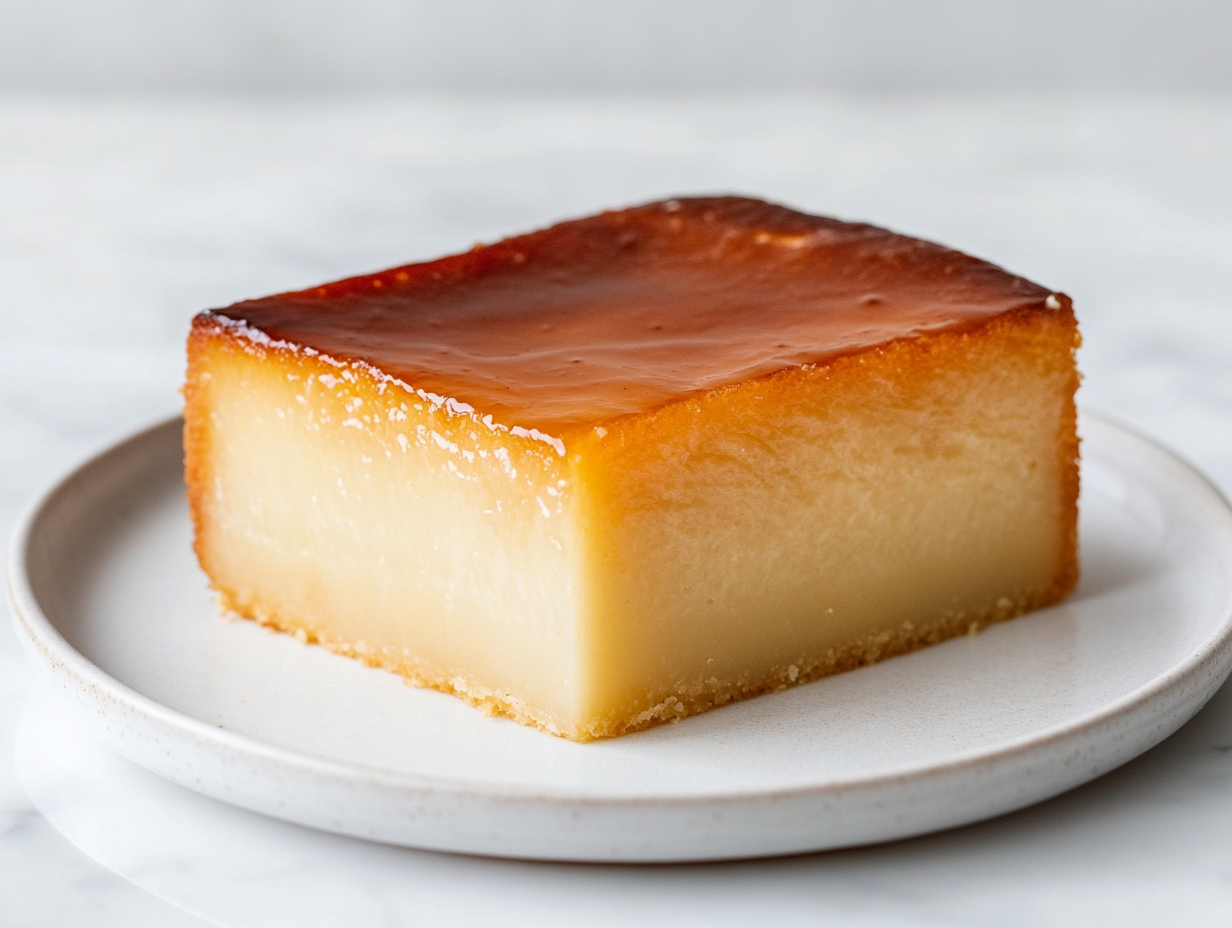 Once the cassava cake is done baking, take it out of the oven. Pour the custard mixture evenly on top of the cake.