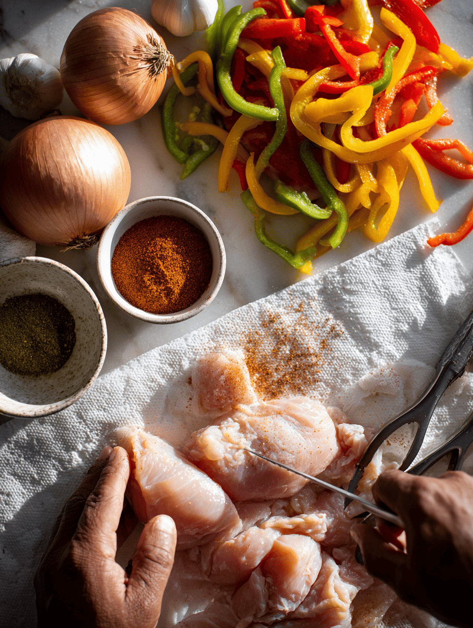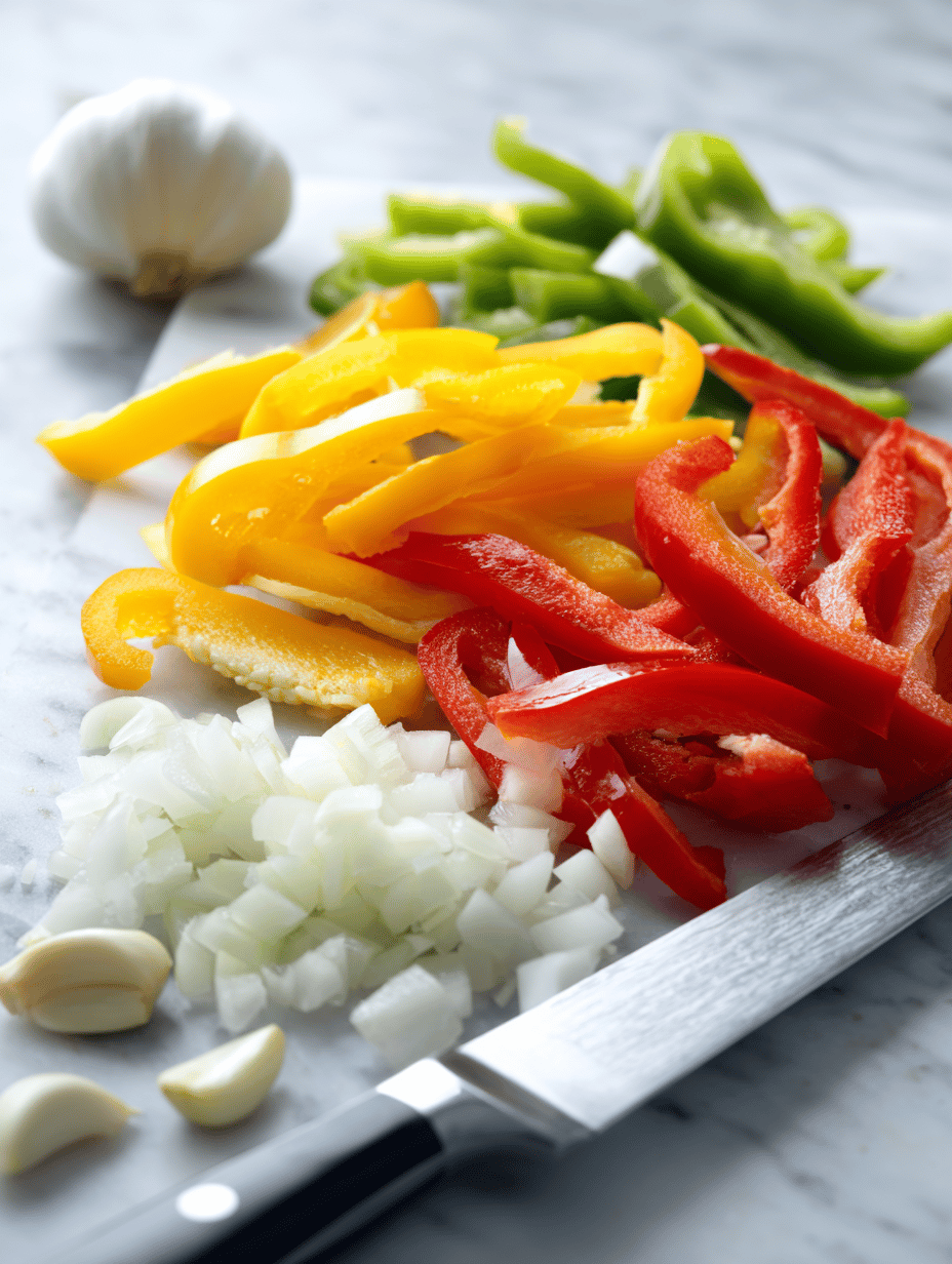 Slice the bell peppers into thick strips and set aside. Thinly slice the onion and mince the garlic cloves.