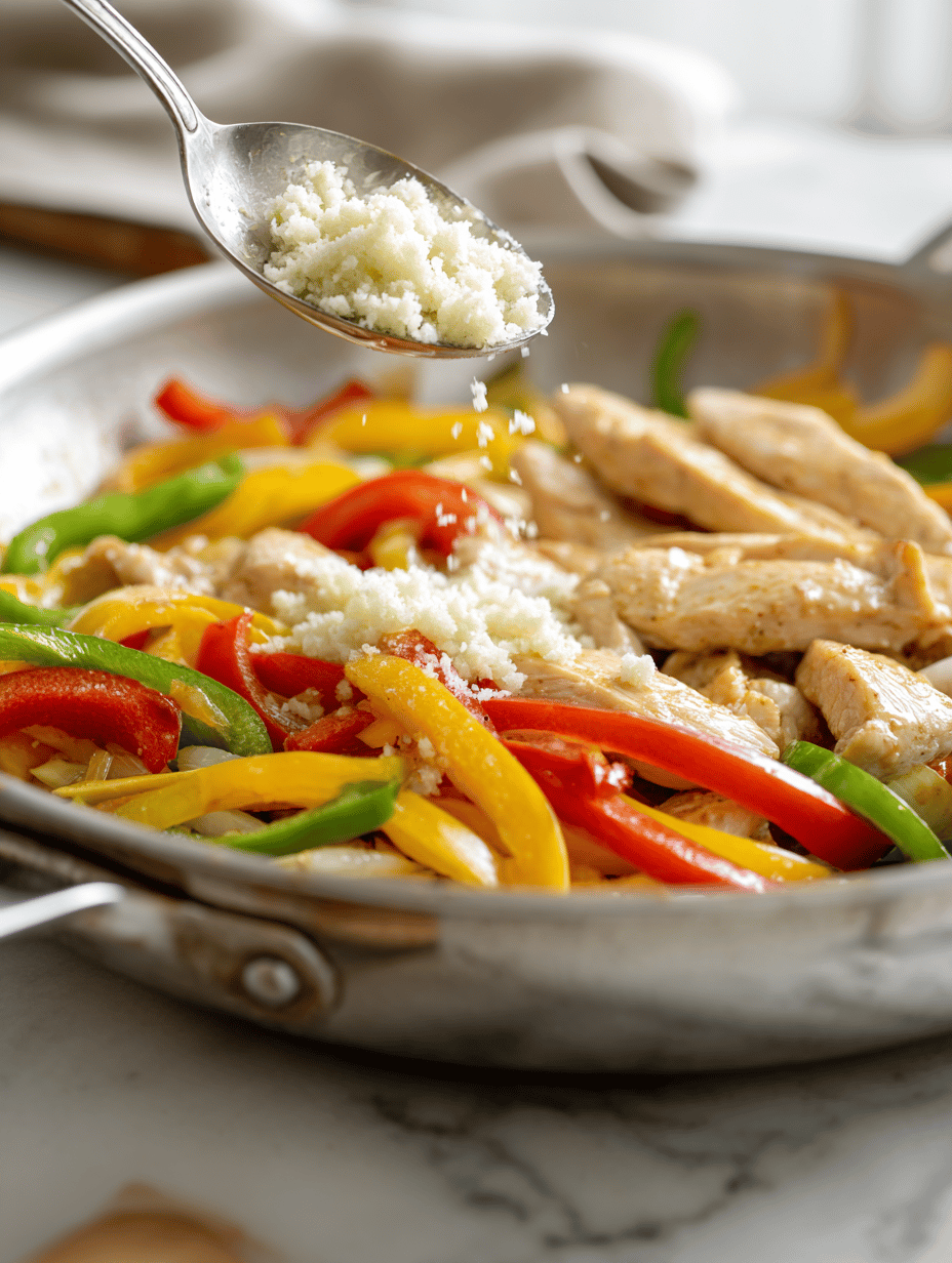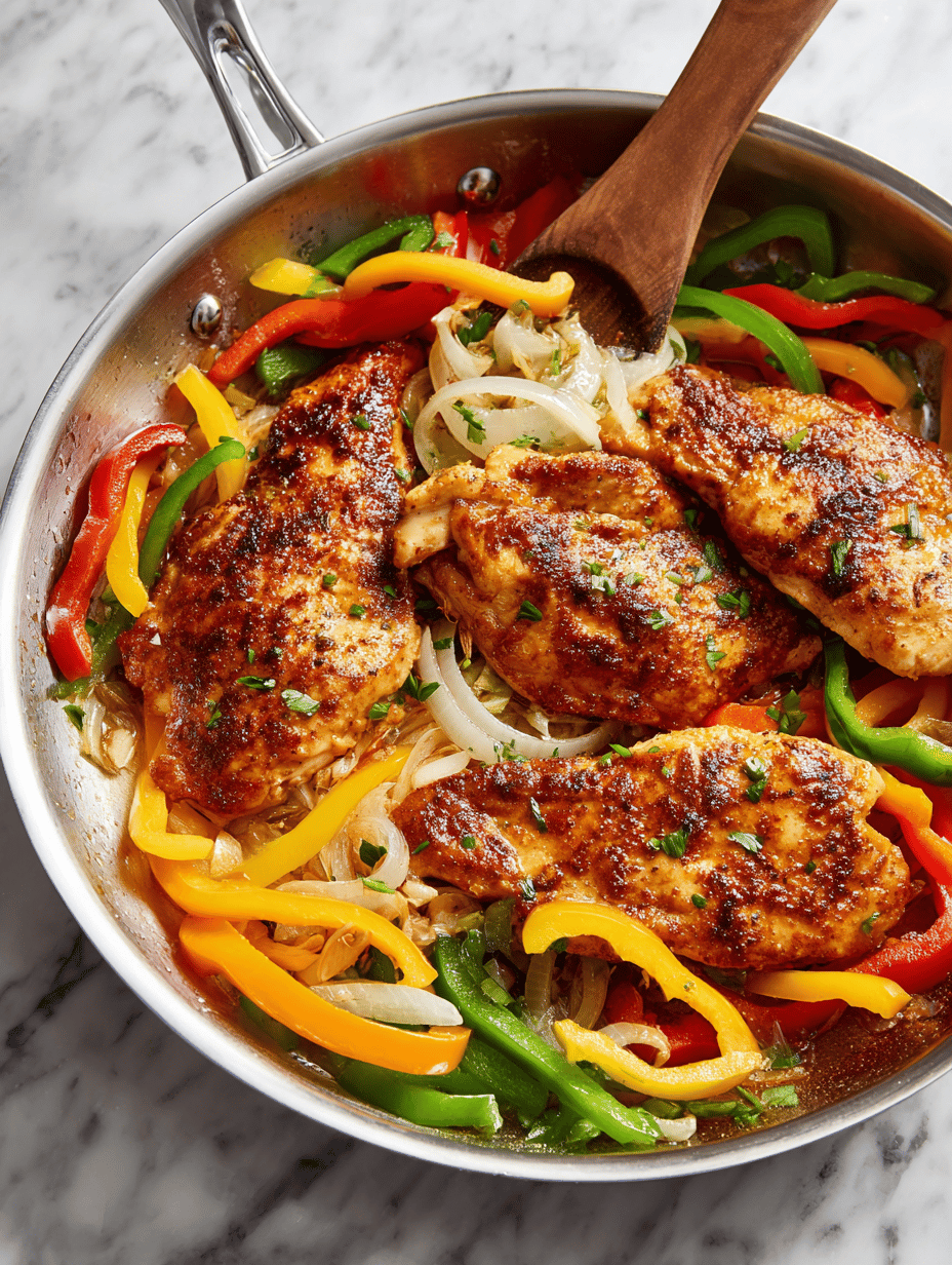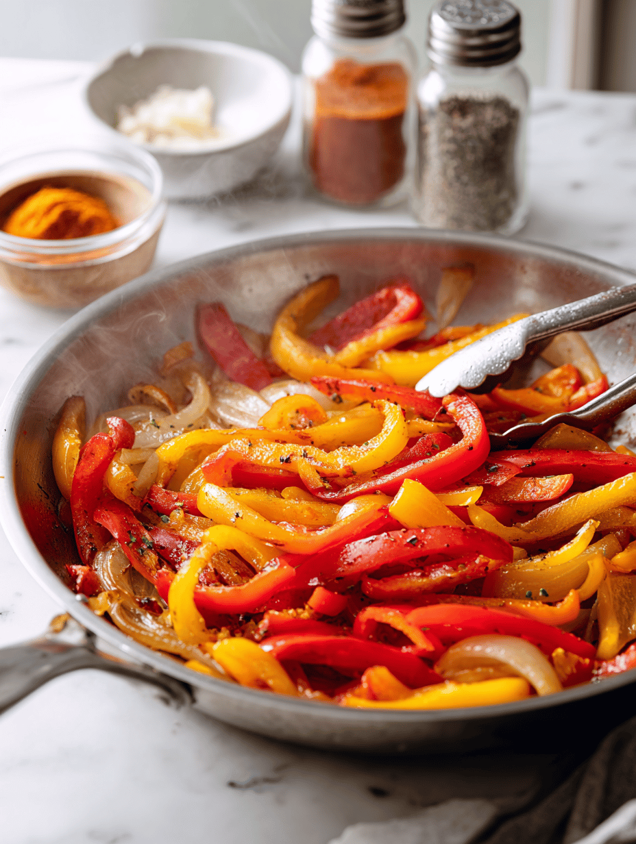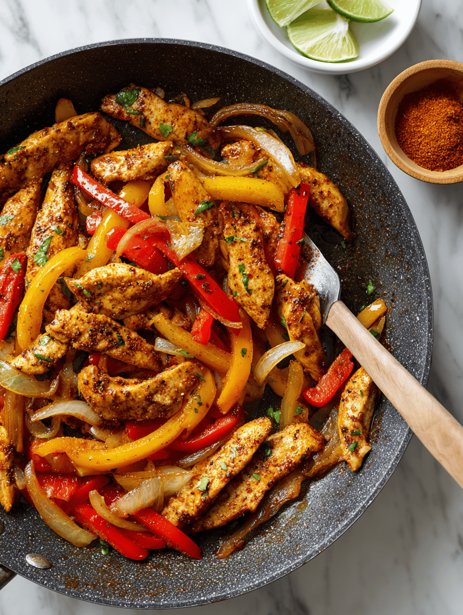 Serve the sizzling chicken and peppers with warm tortillas, letting everyone build their own fajitas. Enjoy the smoky, juicy, and colorful flavors in each bite.