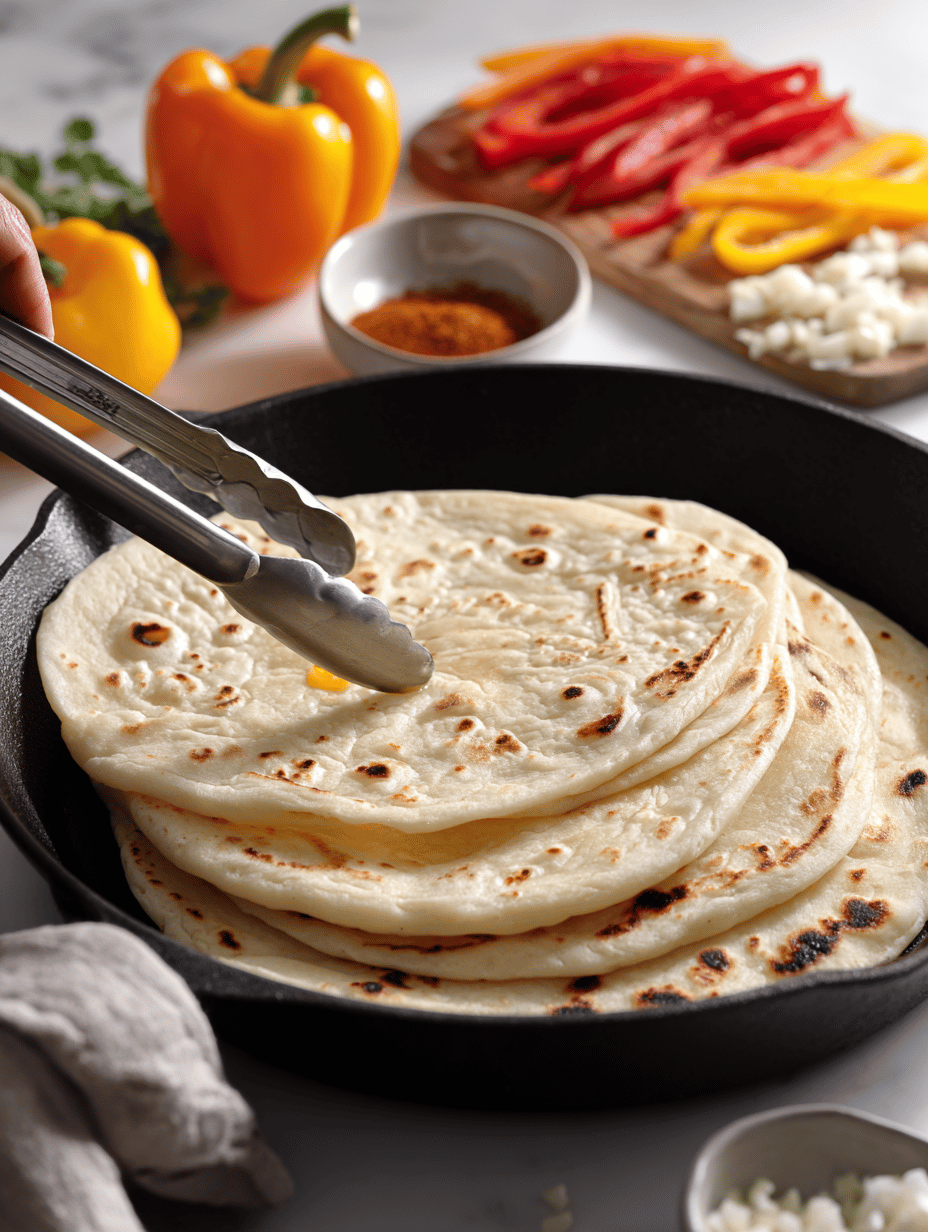 Warm the tortillas by placing them in a dry skillet for about 30 seconds per side or wrapping them in foil and heating in a 180°C (350°F) oven for 10 minutes.