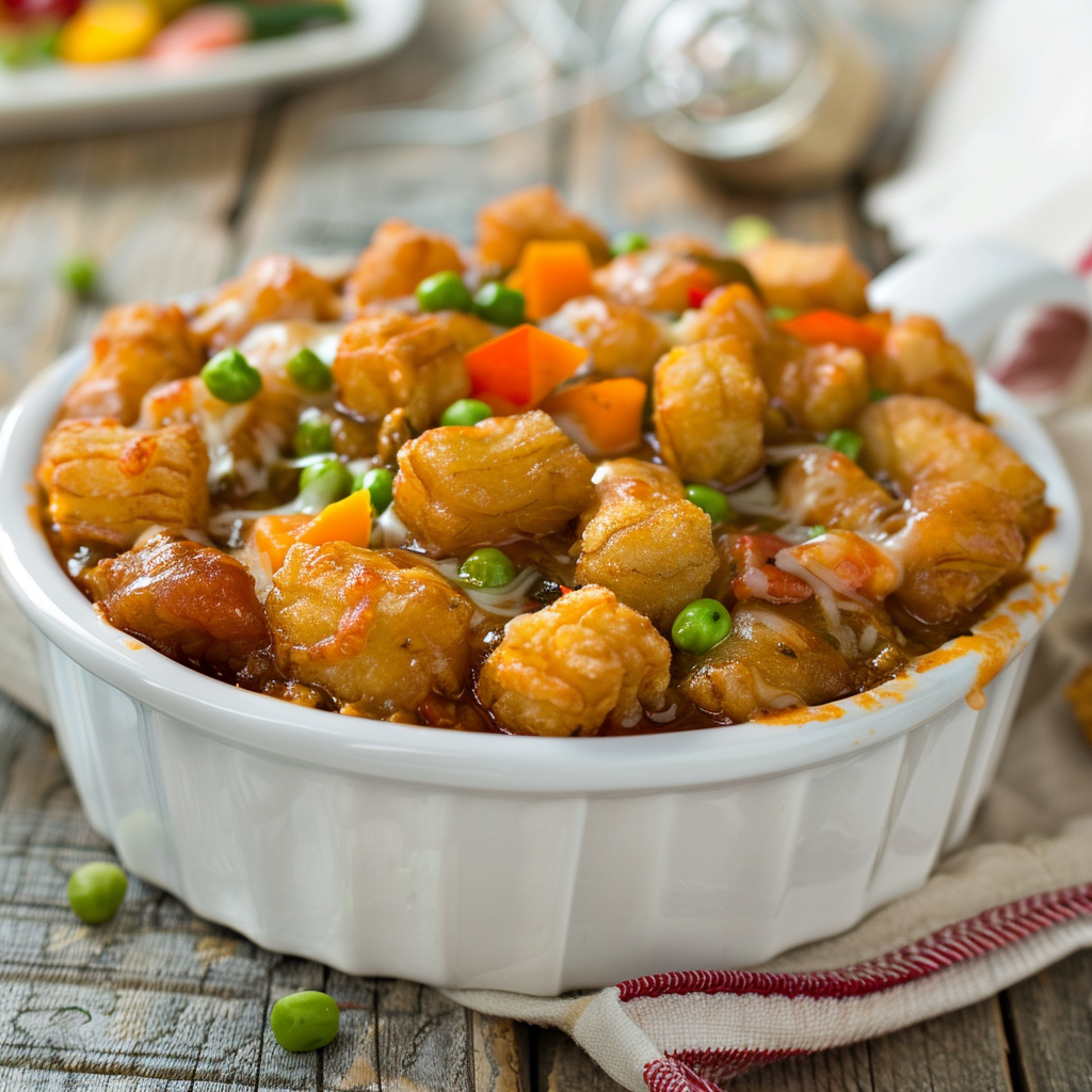 Back to the casserole dish – unite the beef, soup mix, and mixed veggies. Now, here comes the star – layer those tater tots on top like they're the VIPs and sprinkle the remaining cheese.