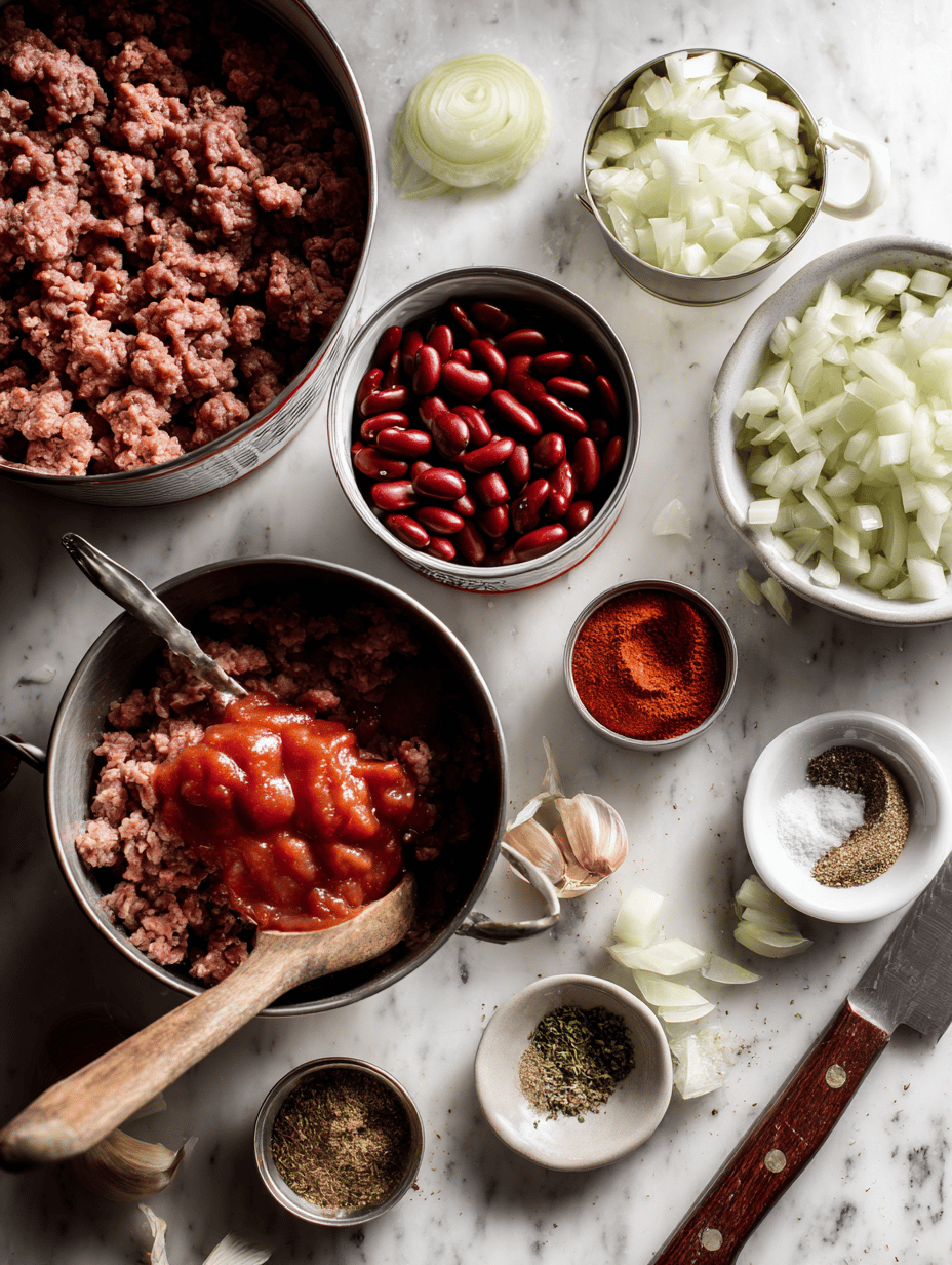 Gather all your ingredients: ground beef, canned tomatoes, beans, onion, garlic, spices, and optional coffee or stout.