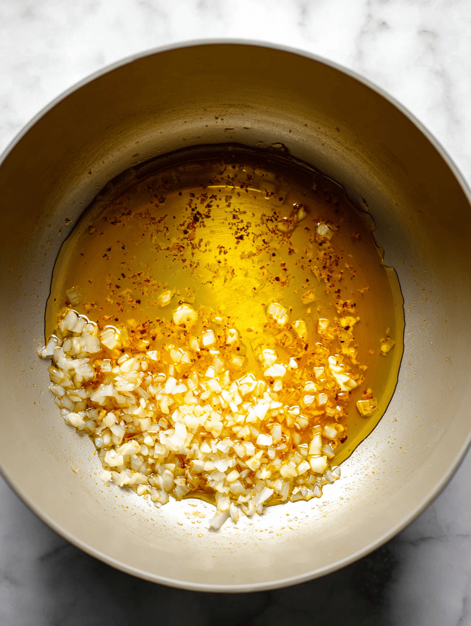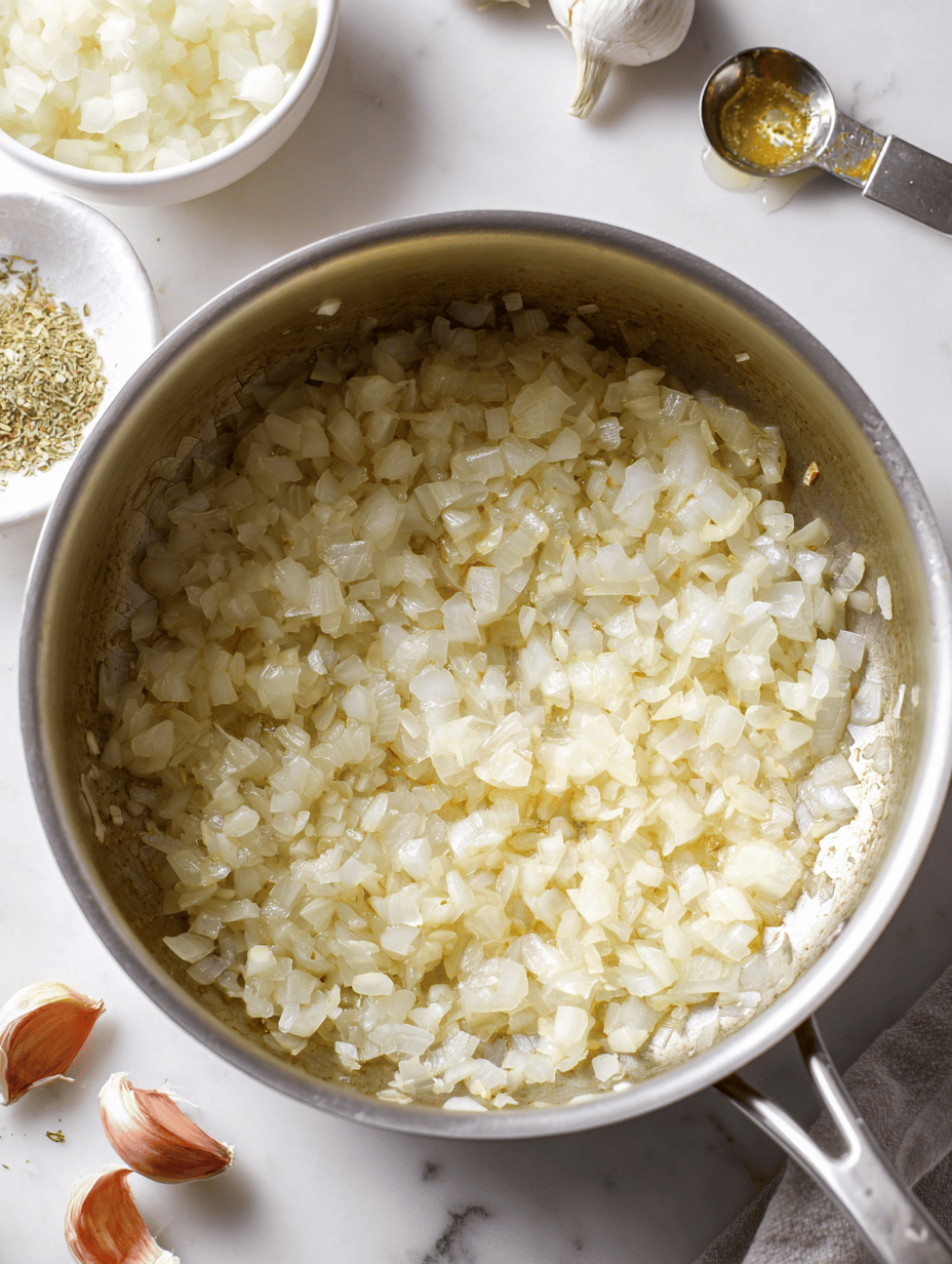 Add the chopped onion and minced garlic to the pot. Sauté, stirring frequently, until fragrant and softened, about 3-4 minutes. The mixture should be glossy and smell sweet and savory.