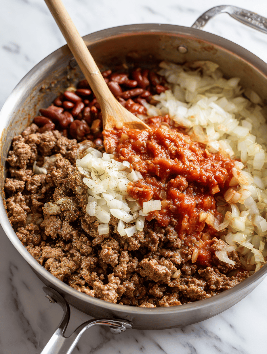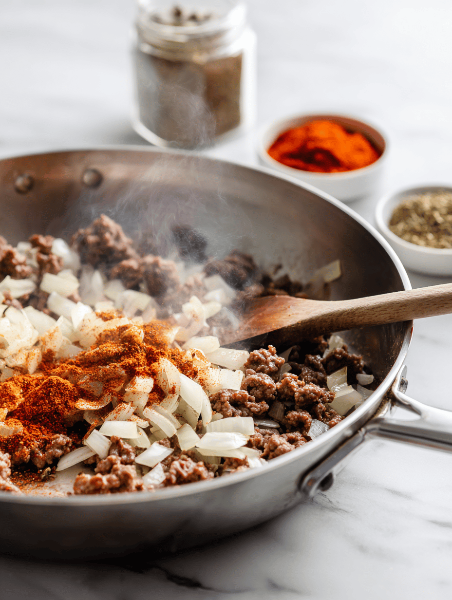 Stir in the chili powder, cumin, and smoked paprika. Let the spices toast for about 1 minute until fragrant, coating the meat and onions with a warm, smoky aroma.