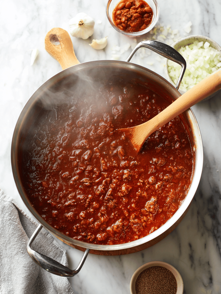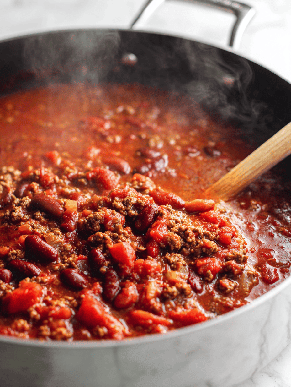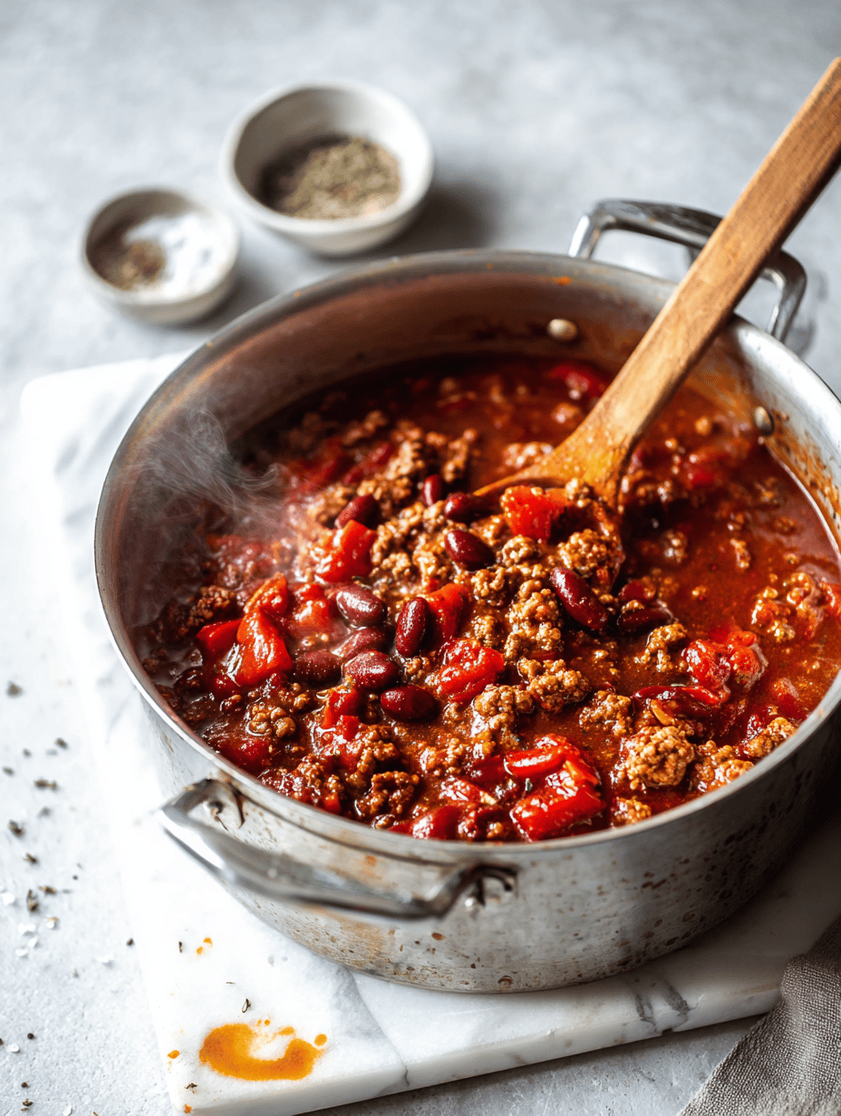 Check the chili periodically. The meat should be tender and browned, beans soft but not mushy, and the sauce rich and thick, clinging to the meat. Adjust seasoning with salt and pepper to taste near the end.