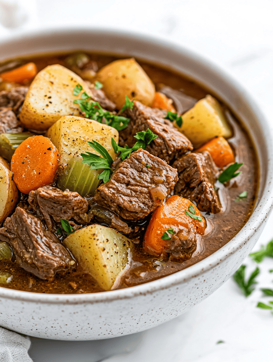 Cover the slow cooker with its lid, set to low, and let the stew simmer gently for 8 hours, or until the beef is tender and vegetables are soft. During cooking, the aroma will deepen, and the broth will thicken slightly.