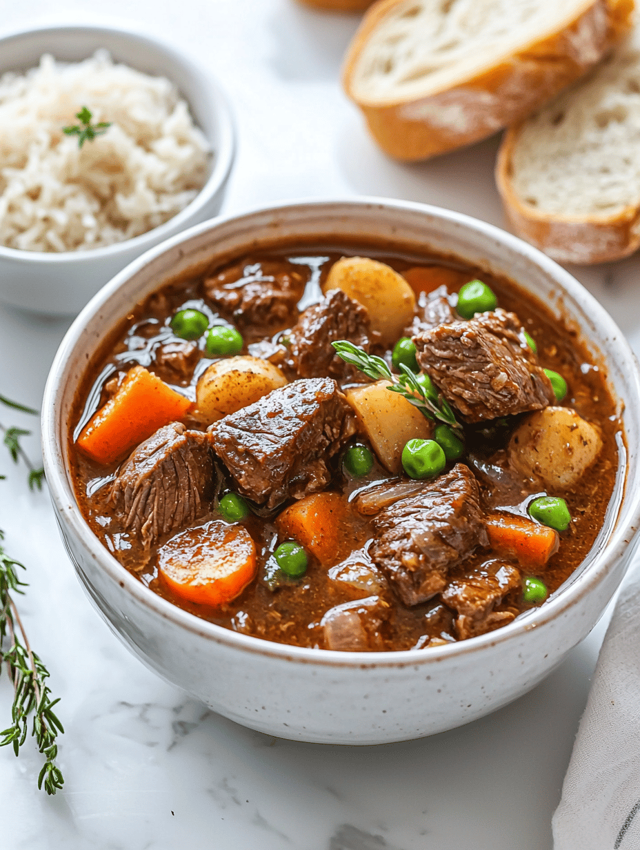 Serve the hearty beef stew hot, with a crusty bread or over cooked rice if desired. The meat will be fall-apart tender, and the sauce rich and inviting.