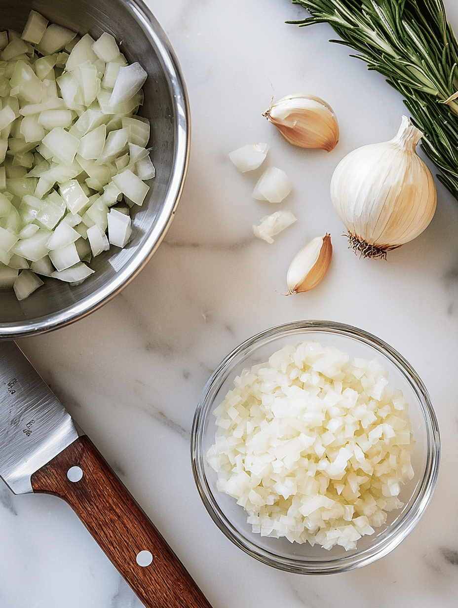 Dice the onion and mince the garlic, then set aside.