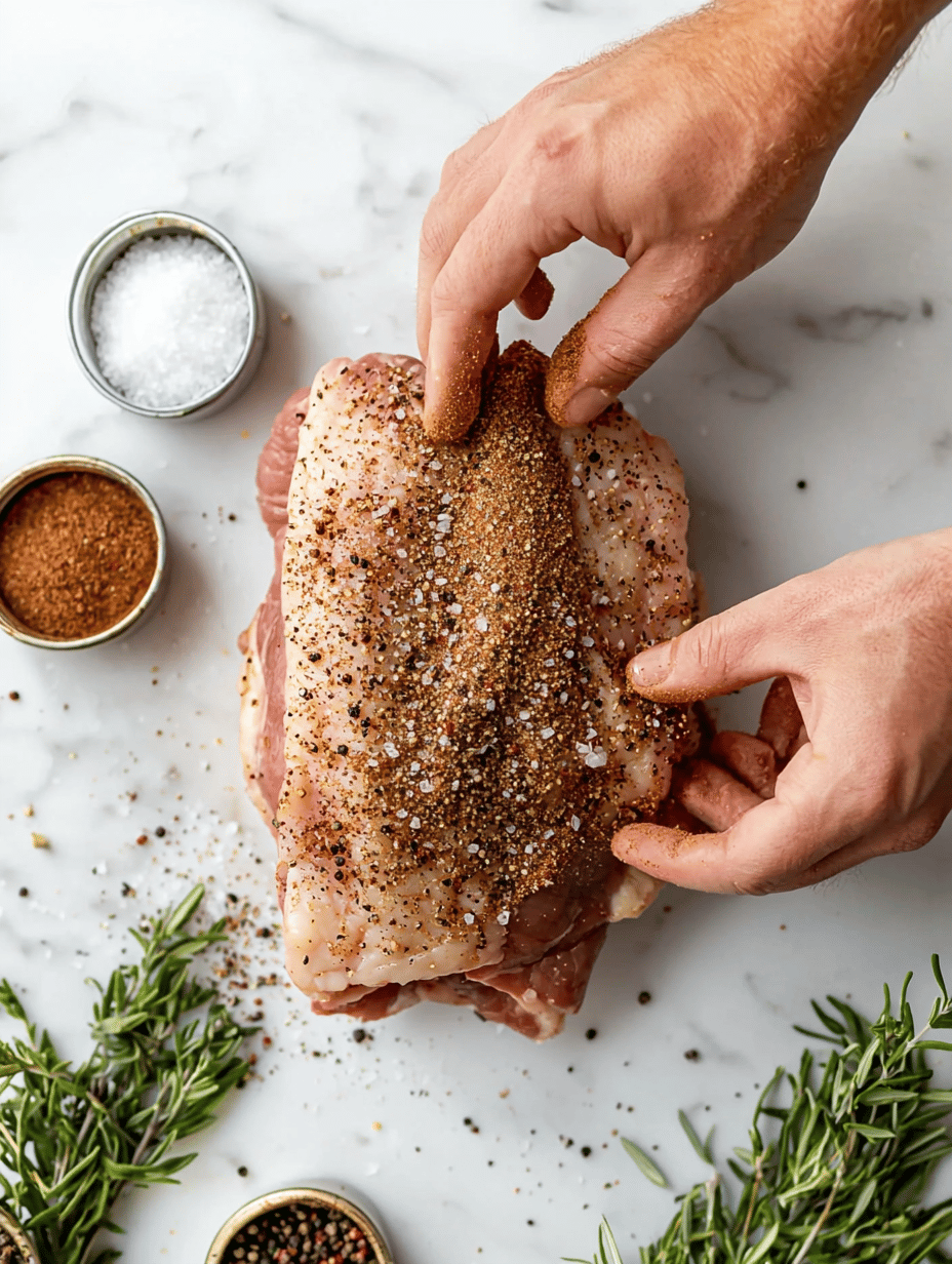 Season the pork shoulder generously with salt, pepper, and ground cinnamon, rubbing the spices into the meat to coat evenly.
