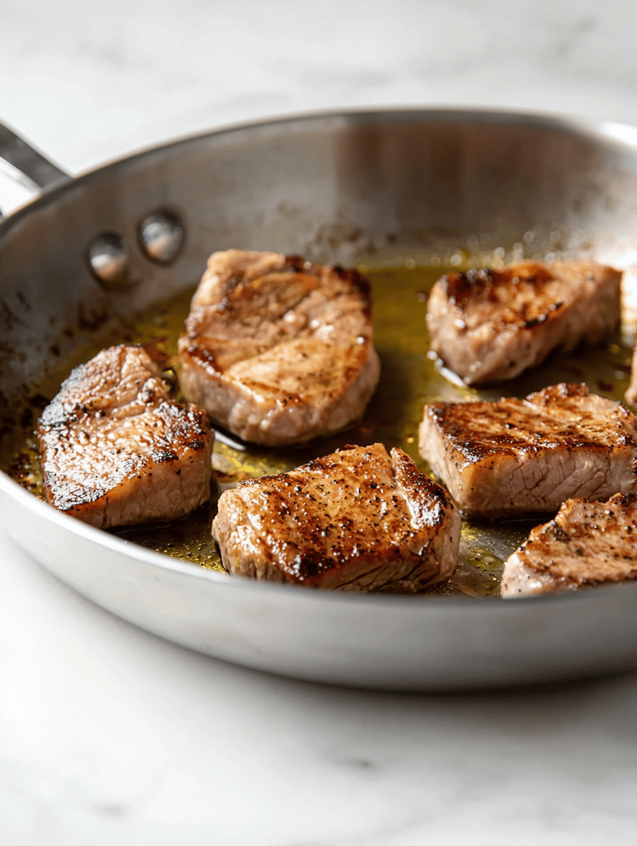 Heat a large skillet over medium-high heat and add olive oil. Once shimmering, sear the pork on all sides until golden brown—about 3-4 minutes per side—creating a flavorful crust.