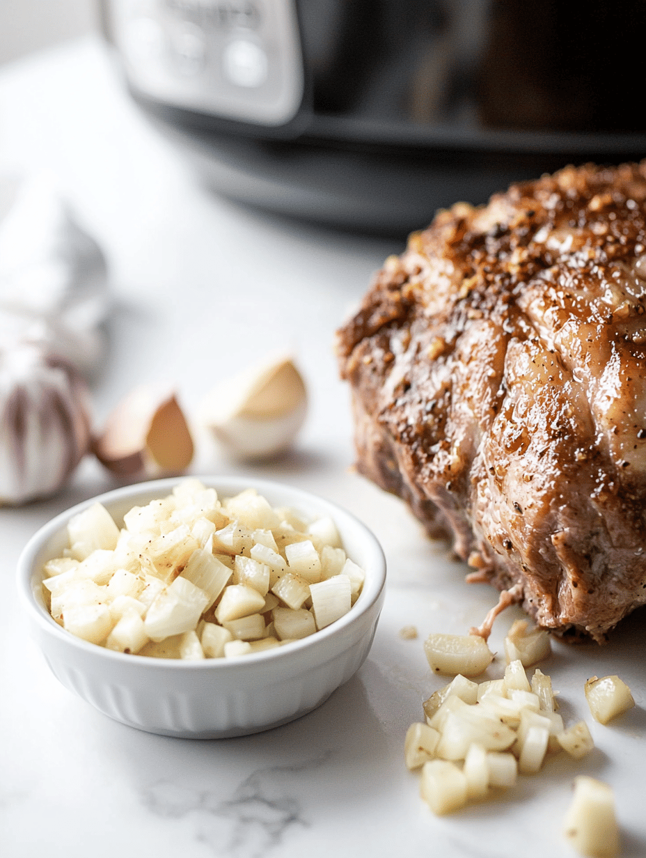 Add minced garlic cloves around the pork in the slow cooker for aromatic depth.