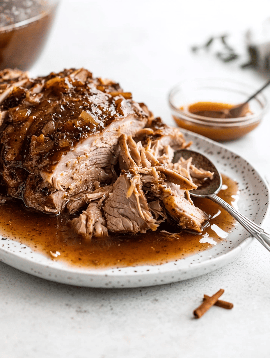 Shred the pork with two forks or slice it into thick pieces, then arrange on a platter. Spoon the rich apple-spiced cider sauce over the top for serving.