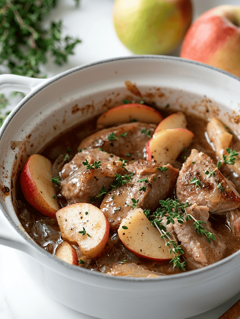 This dish features tender pork cooked slowly alongside apple cider and warm spices, resulting in moist meat with a caramelized exterior and flavorful, aromatic sauce. The slow-cooking process ensures the pork becomes soft and easy to shred or serve slices, with a rich, slightly tangy glaze coating the meat.
