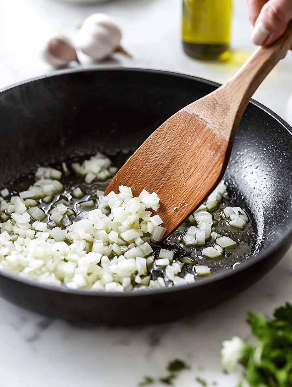 Heat the olive oil in a skillet over medium heat, then add the finely chopped onion. Sauté until translucent and fragrant, about 3-4 minutes.