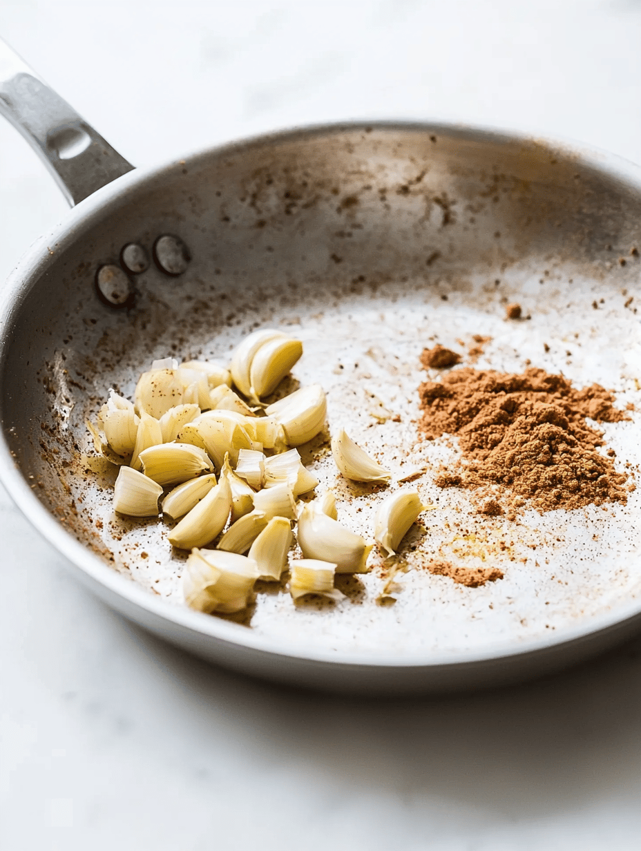 Add the minced garlic and ground cinnamon to the skillet, cooking for another 30 seconds until the garlic is fragrant.