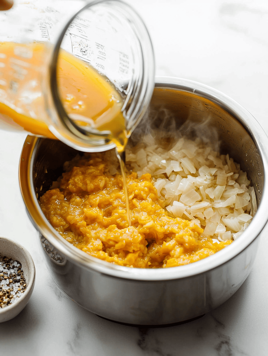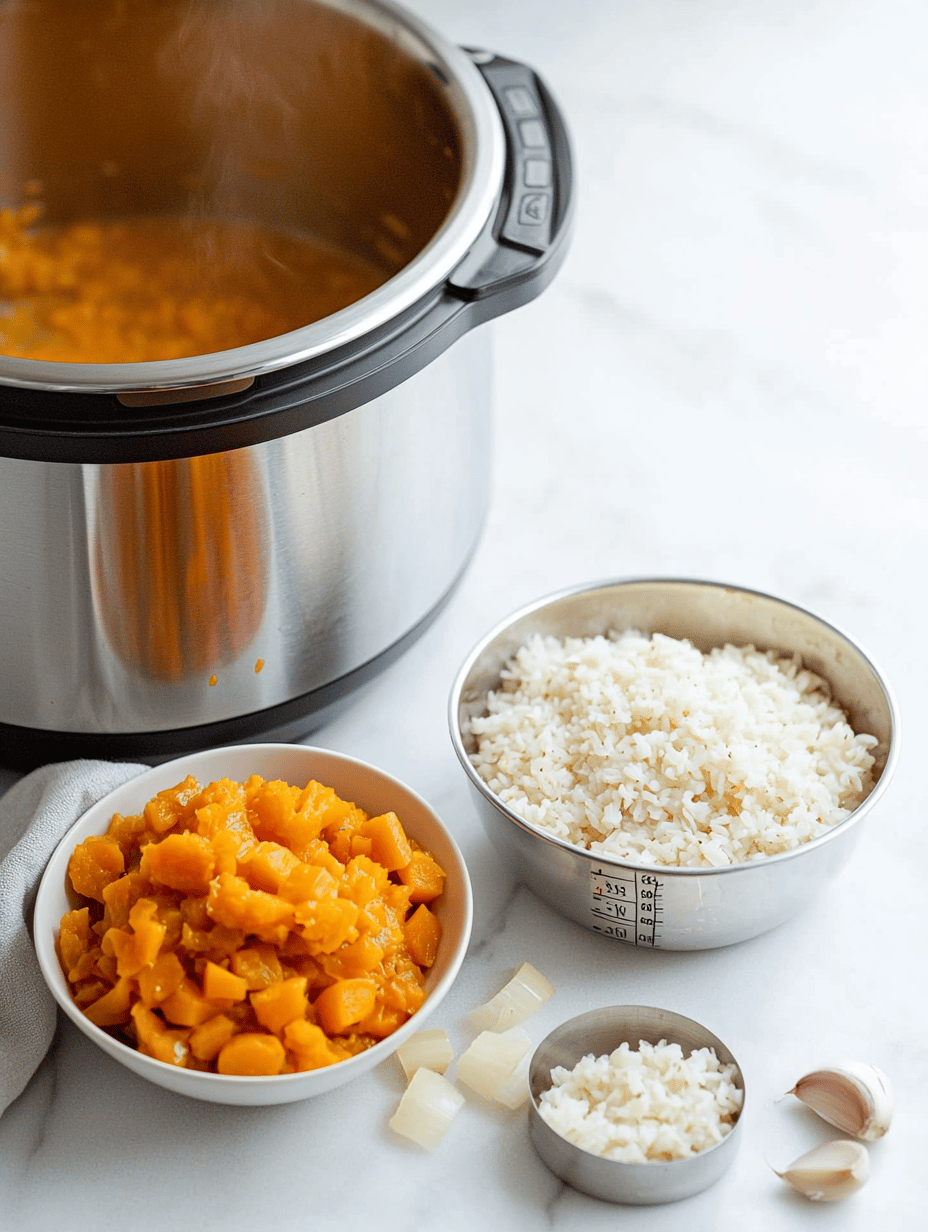 Transfer the sautéed onion and garlic mixture to the slow cooker, then add the Arborio rice and pumpkin puree. Stir to combine everything evenly.