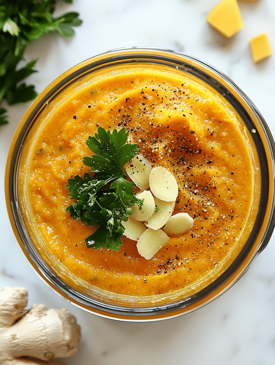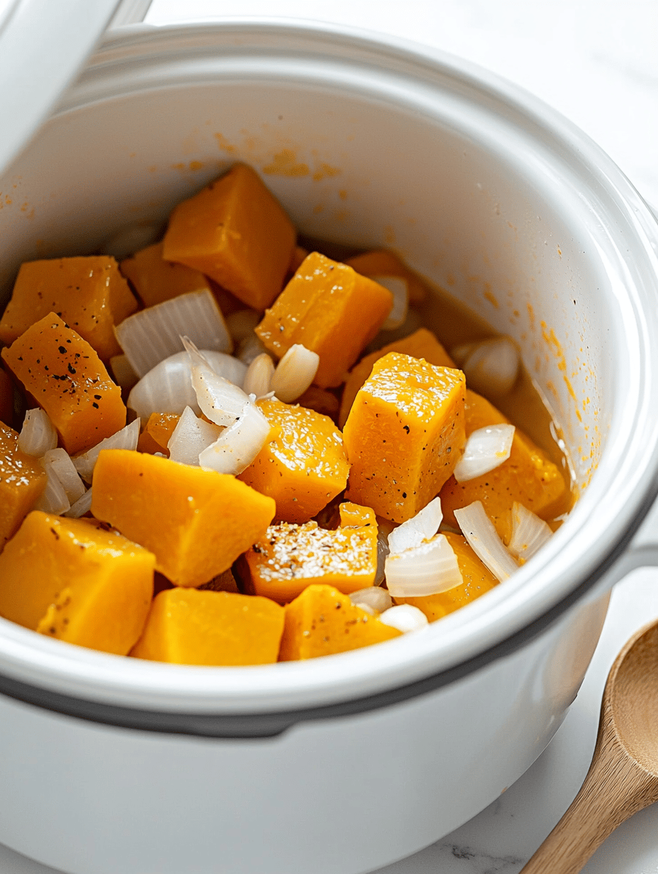 This slow cooker pumpkin soup combines roasted pumpkin with warming spices, blended into a smooth, velvety consistency. The cooking process involves simmering ingredients until tender and flavorful, resulting in a thick, slightly sweet soup with a touch of spice and a glossy appearance.