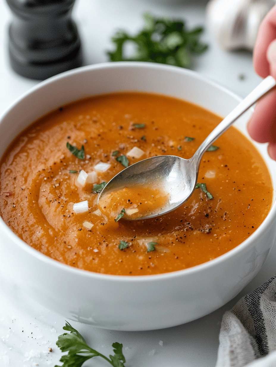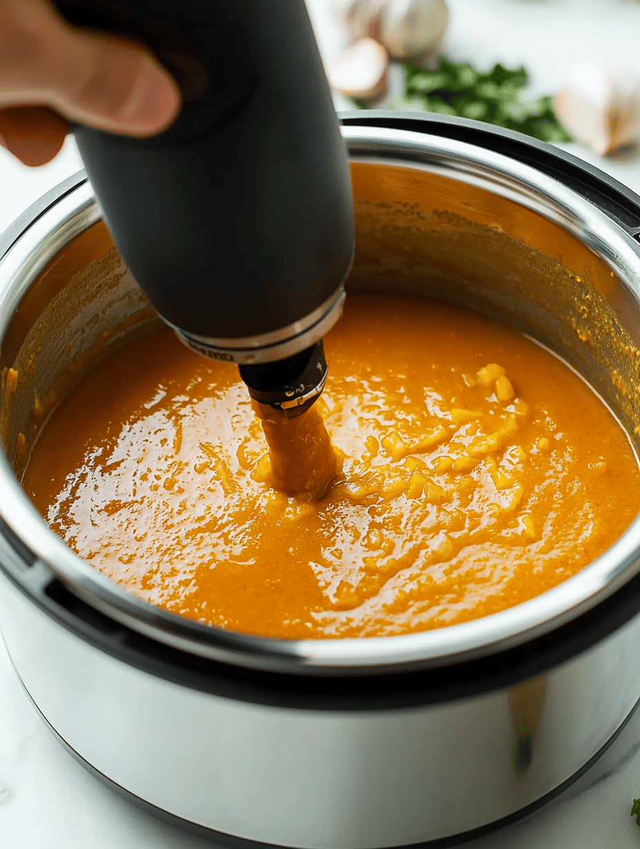 Once the cooking time is up, use an immersion blender to blend the soup directly in the slow cooker until smooth and velvety, or carefully transfer to a blender in batches and blend until creamy.