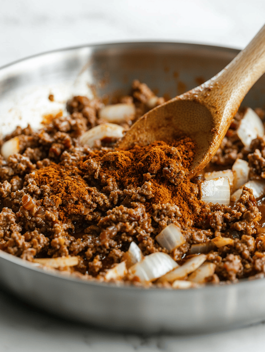 Stir in the chili powder, smoked paprika, and cumin, coating the meat and onions evenly. Toast the spices for 1-2 minutes until fragrant, causing the mixture to smell warm and spicy.