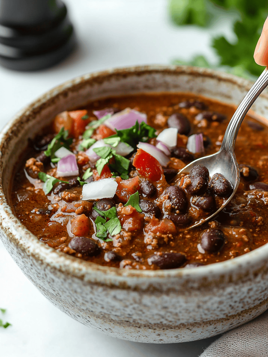 Once the chili is thick and flavorful, ladle it into bowls and serve hot, garnished with your favorites like chopped cilantro or shredded cheese if desired.