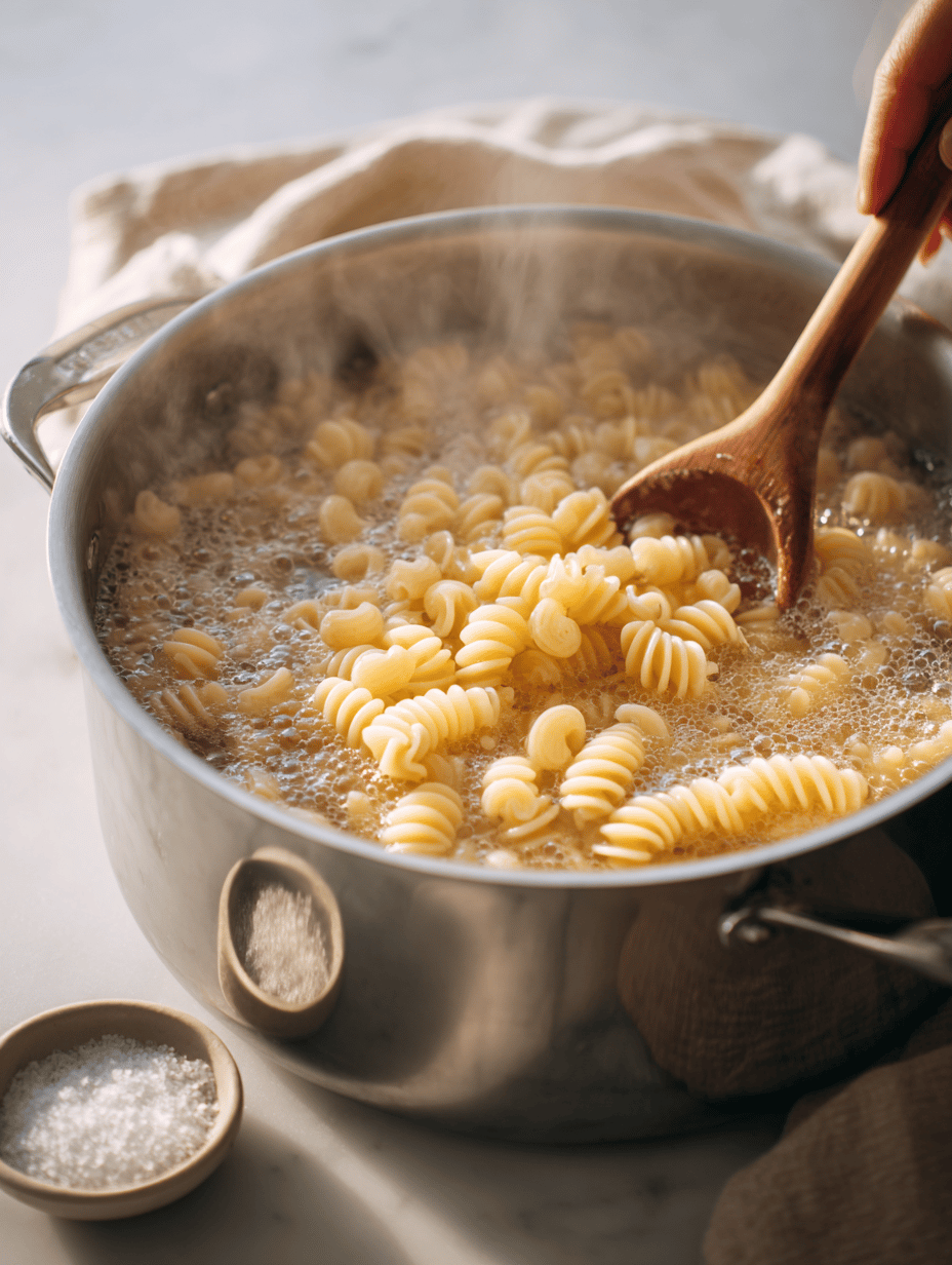 Bring a large pot of salted water to a rolling boil, then add the pasta and cook until just al dente, about 8 minutes. Drain quickly and set aside.