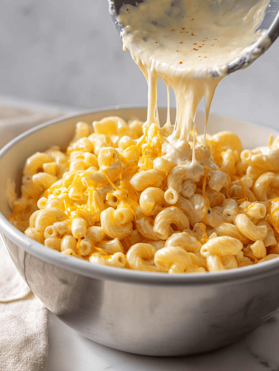 Fold the drained pasta into the cheese sauce, tossing gently to coat every noodle evenly and create a luscious, cheesy mixture.