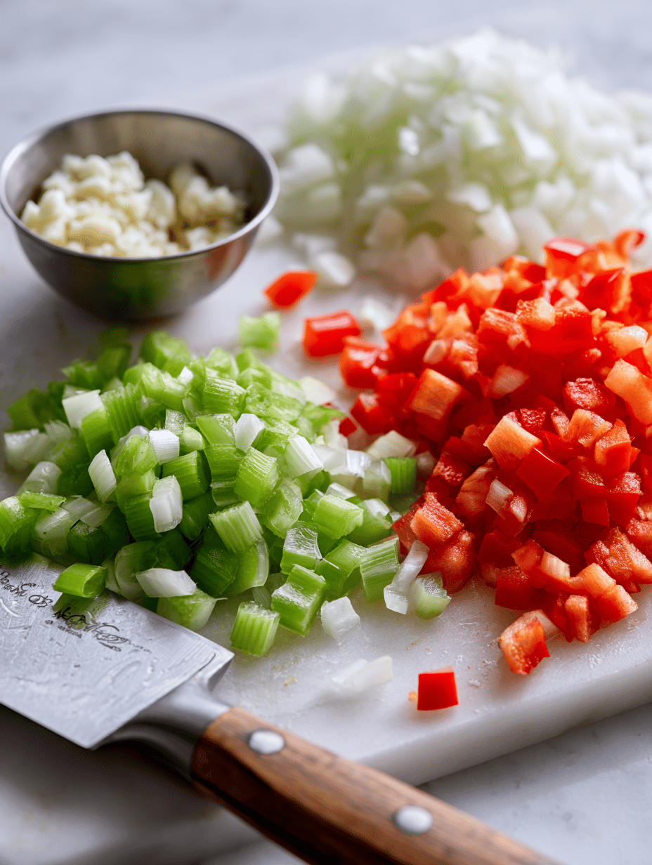Dice the onion, bell pepper, and celery, and mince the garlic. Set aside.