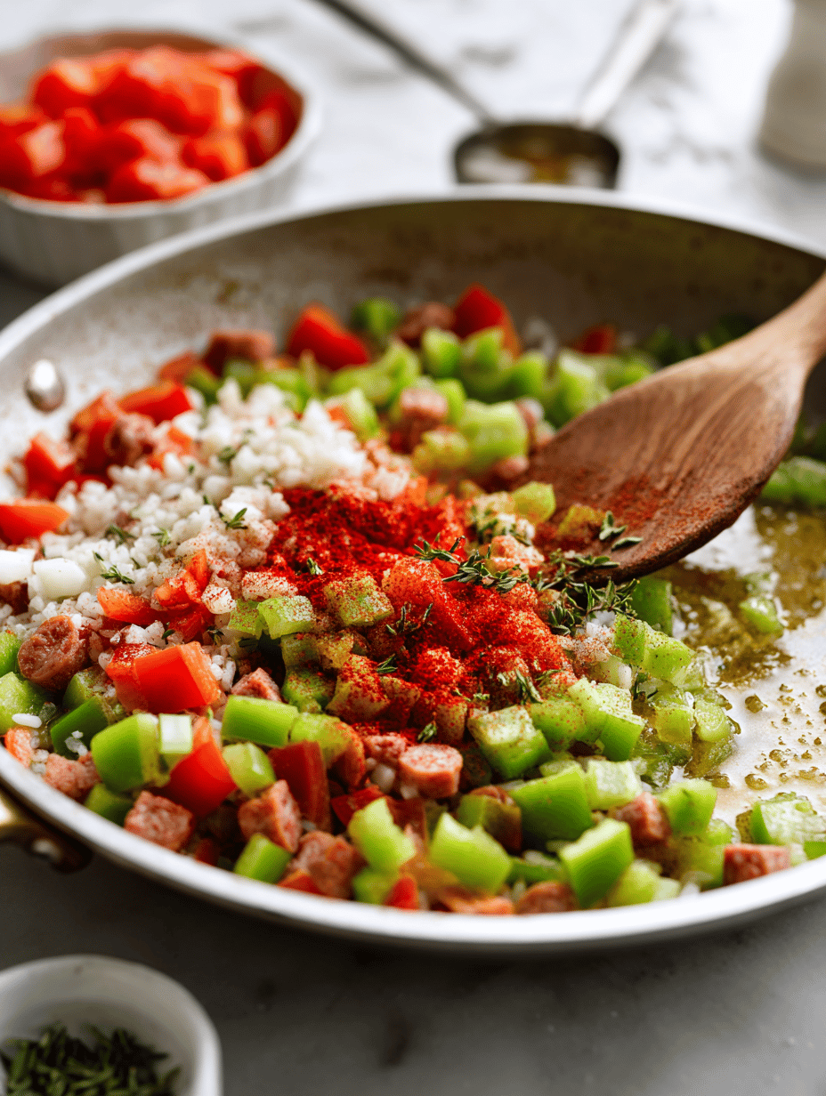 In the same pot, add the diced onion, bell pepper, celery, and minced garlic. Cook, stirring occasionally, until the vegetables are softened and fragrant, about 8 minutes. The mixture should smell sweet and look slightly caramelized around the edges.