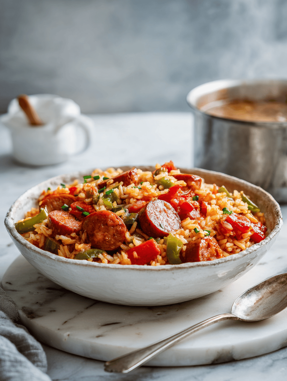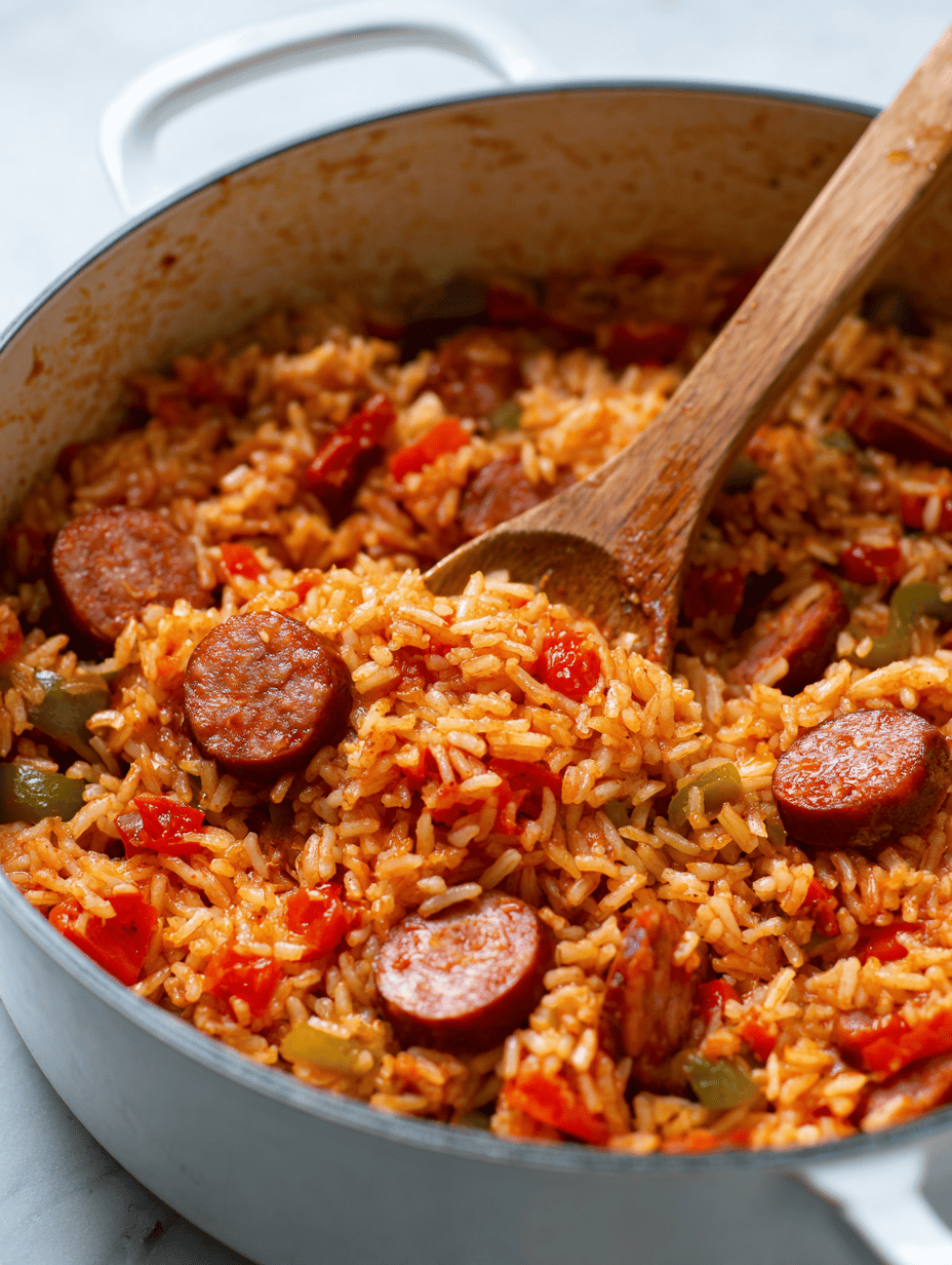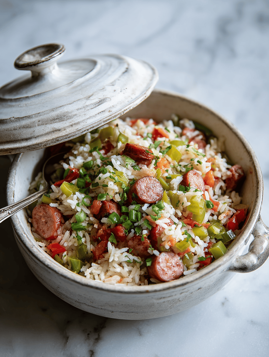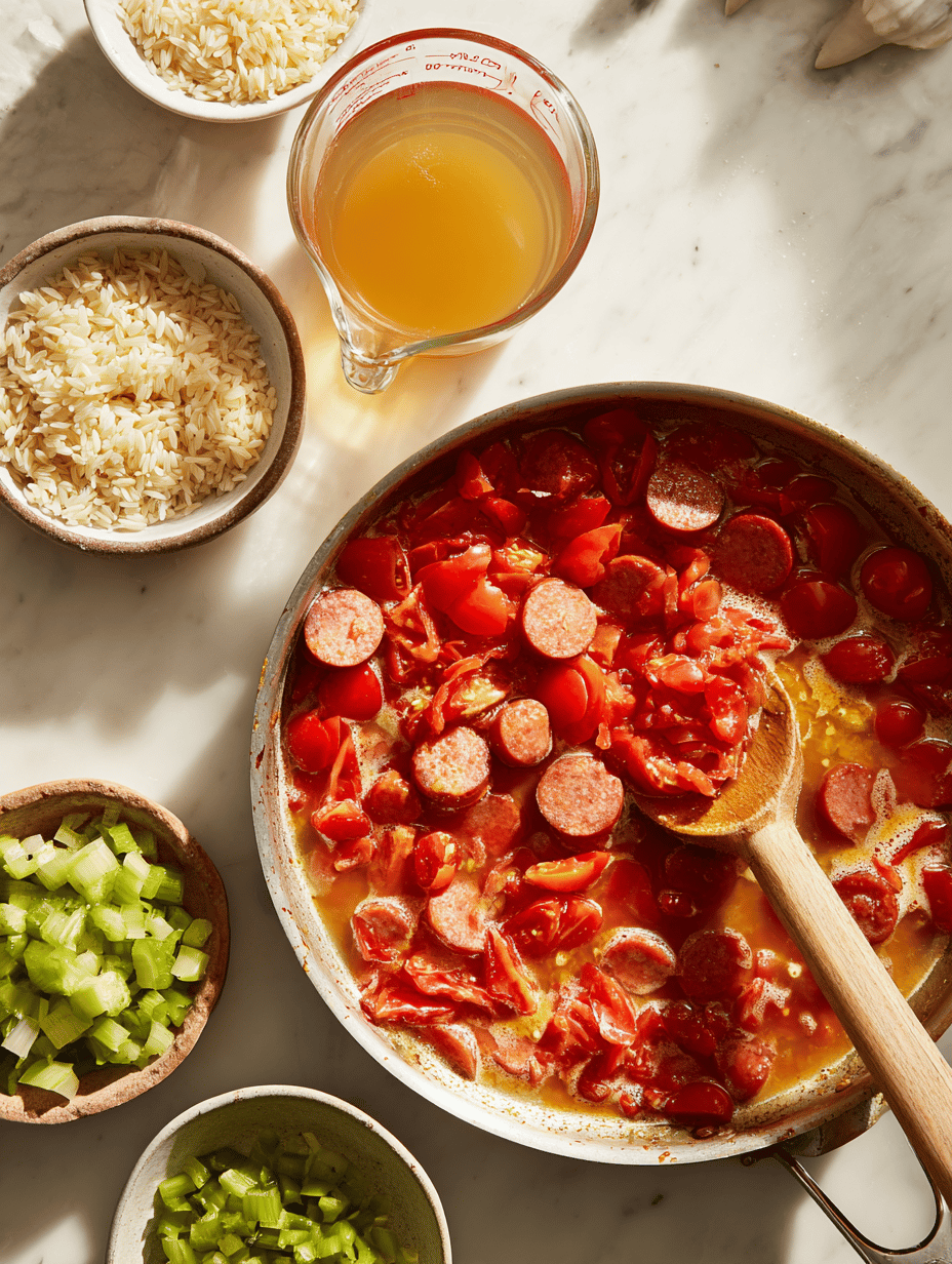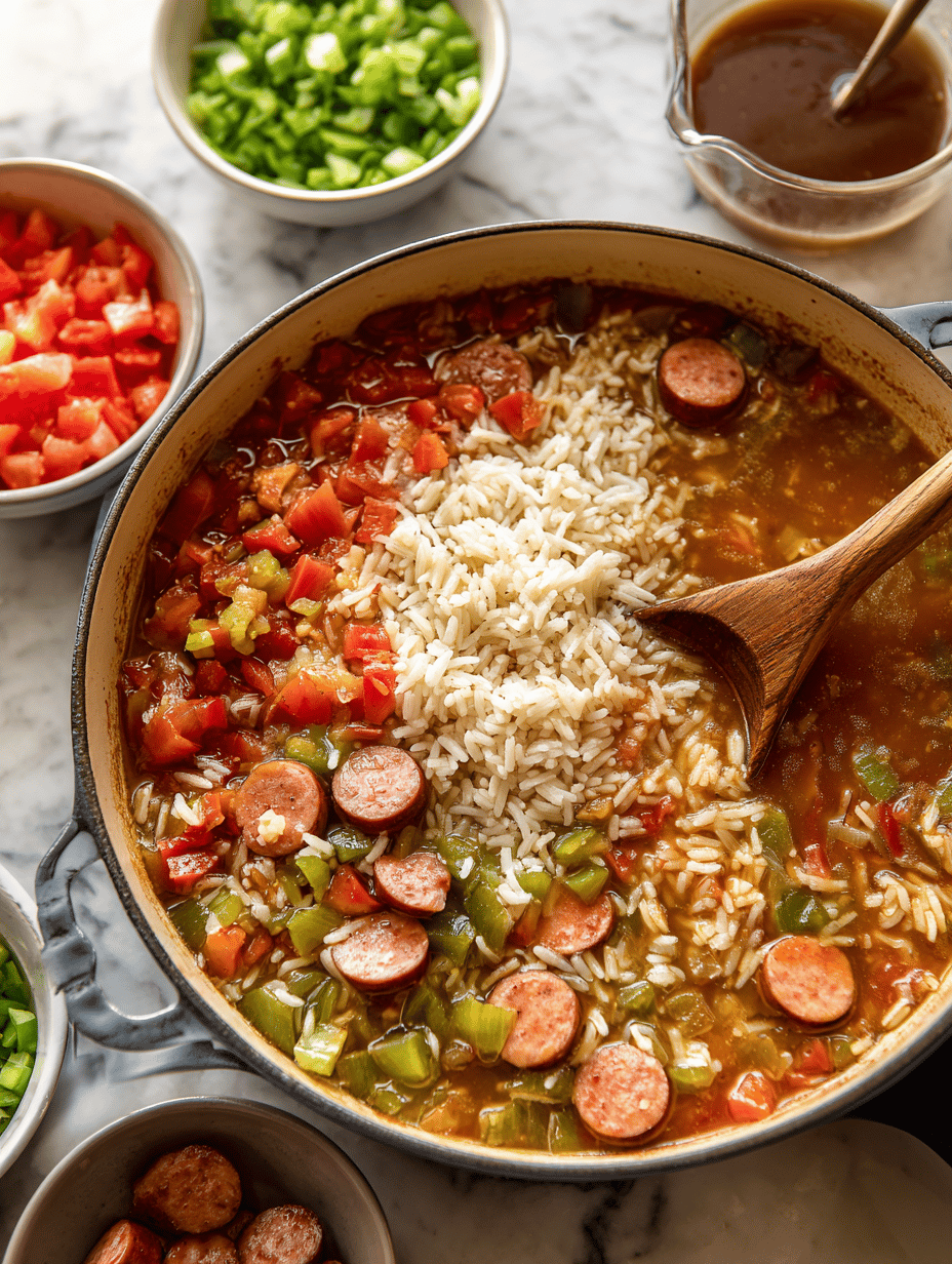 Check the rice; it should be tender and slightly sticky, with a vibrant aroma of spices and smoky sausage. If needed, cook a few more minutes uncovered to evaporate excess liquid.