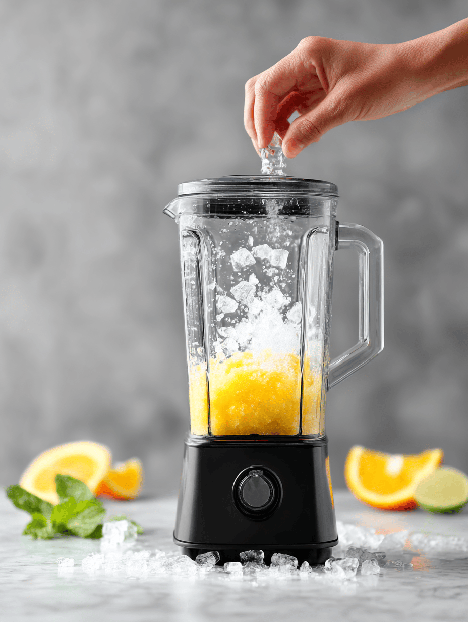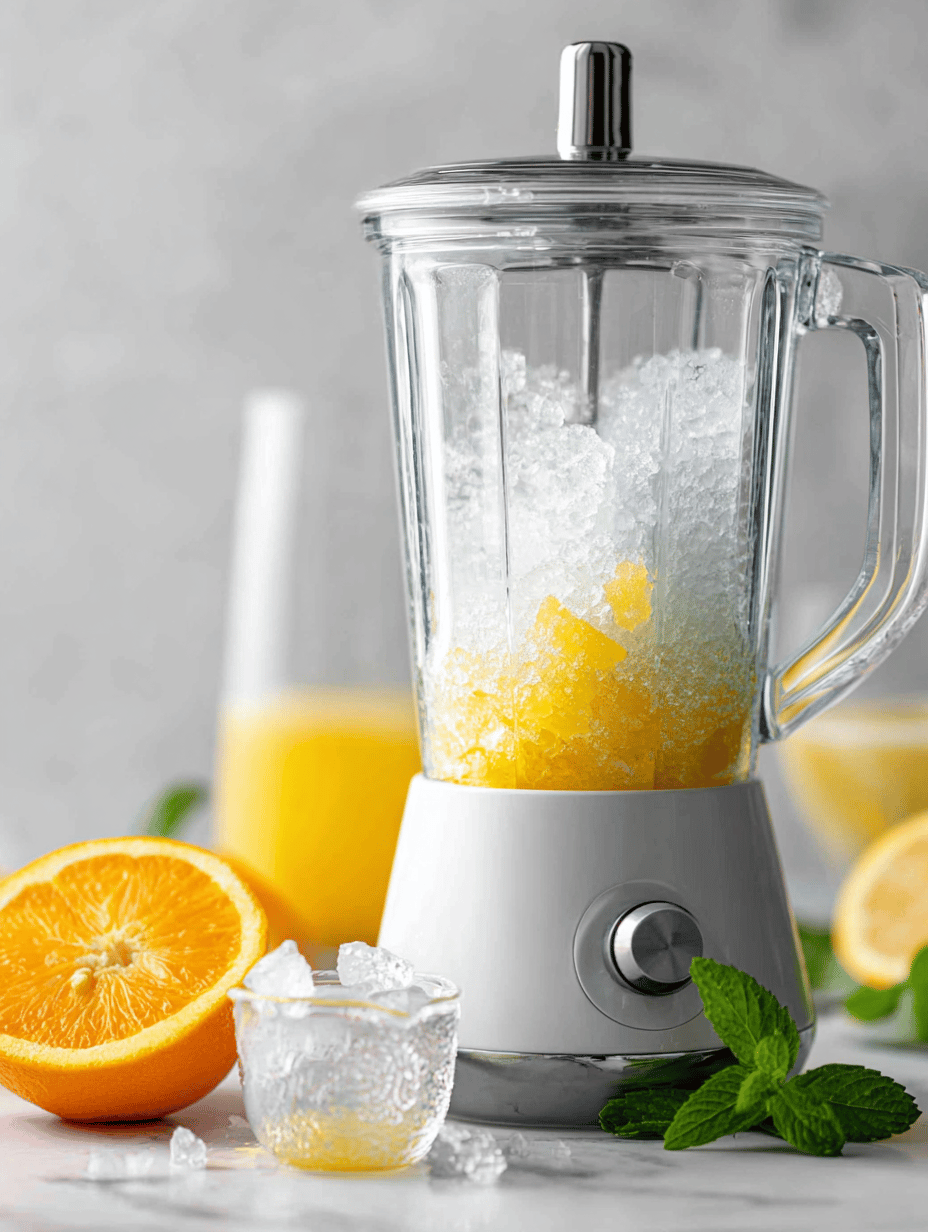 Pour the fresh citrus juice into a blender, then add the simple syrup and crushed ice.