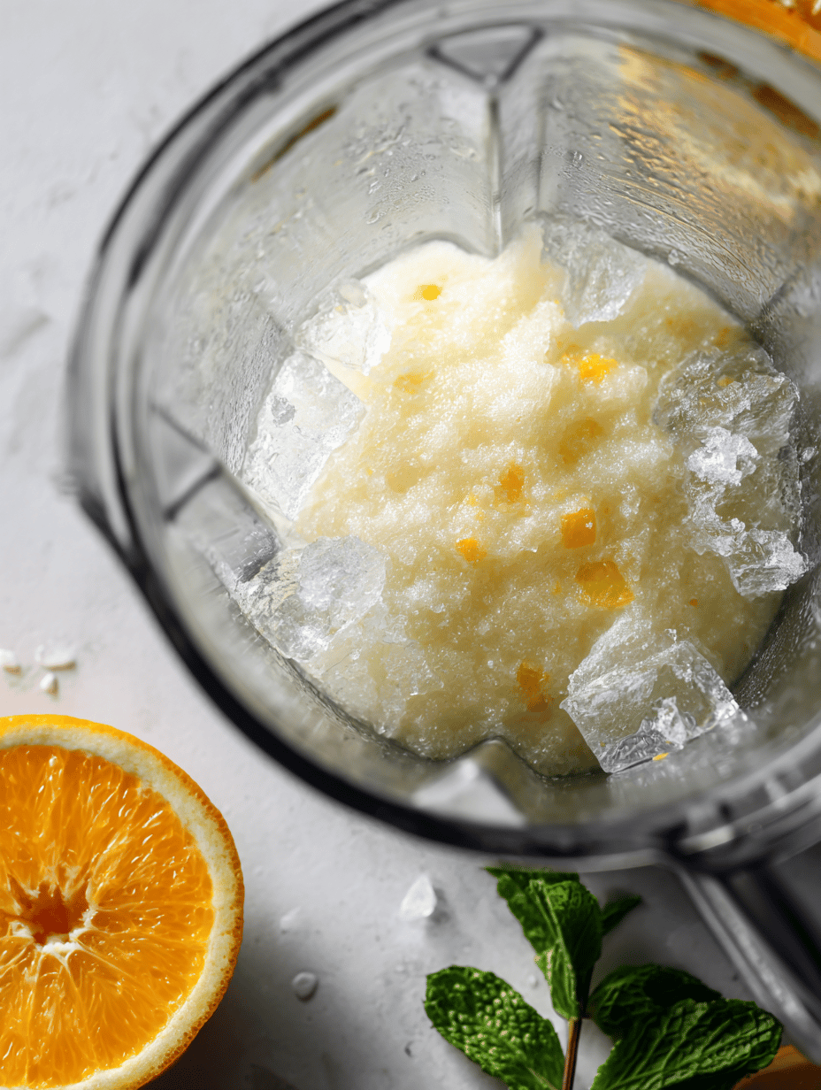 Blend on high for about 30-45 seconds until the mixture is thick, icy, and has tiny ice crystals shimmering throughout.