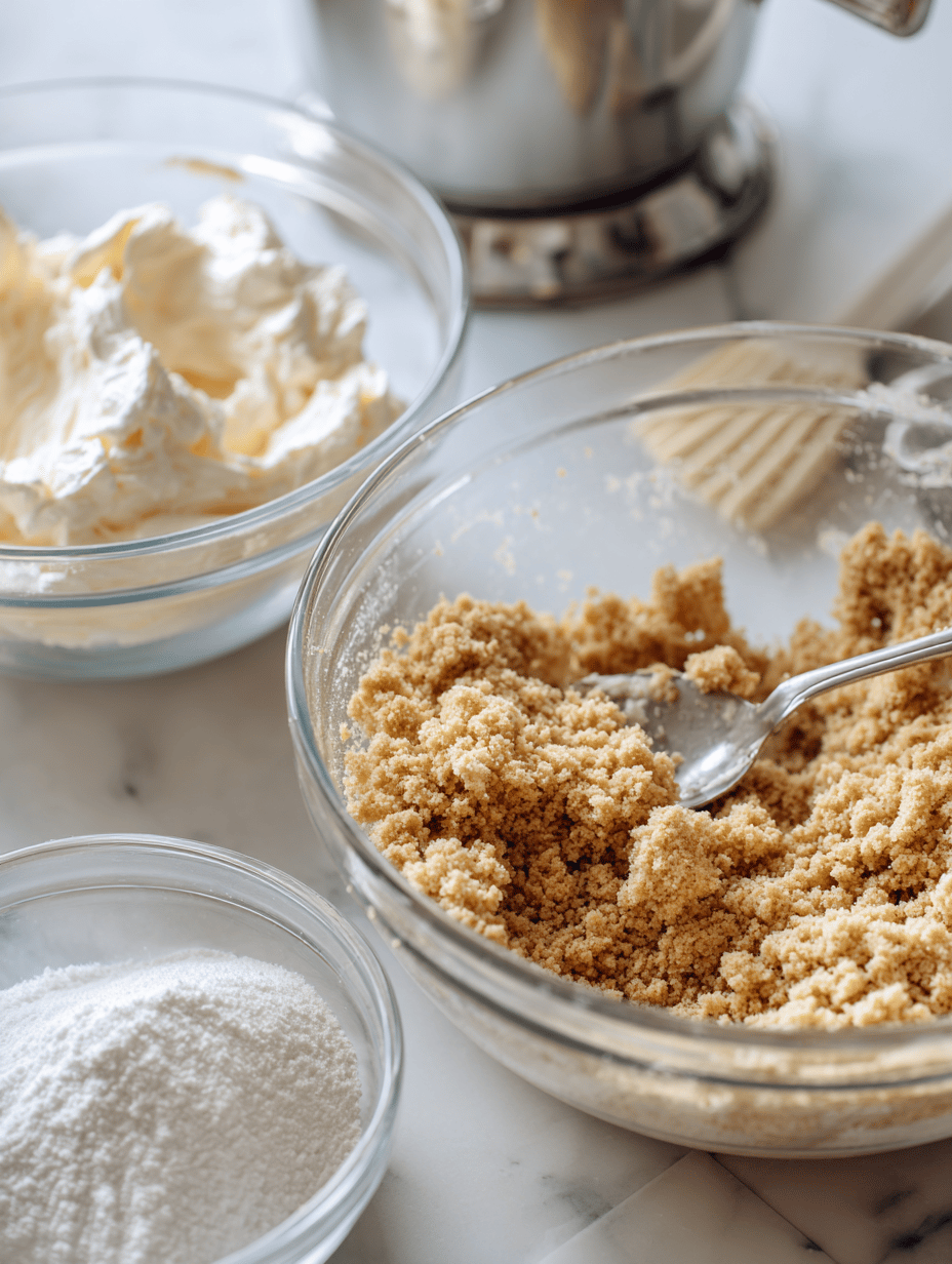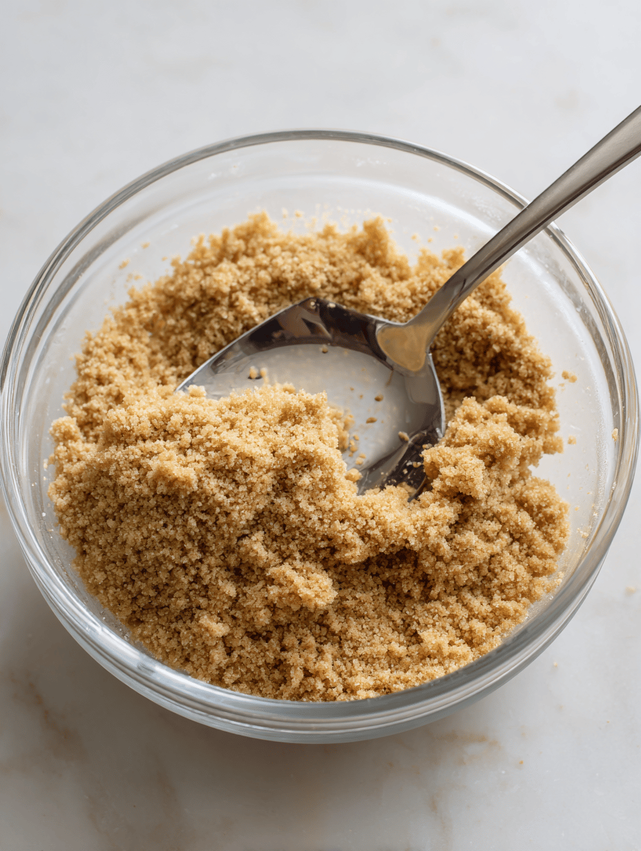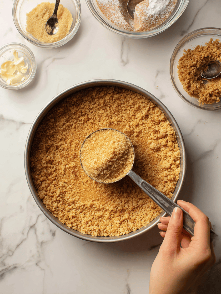 Mix the graham cracker crumbs with melted butter and a pinch of salt until the crumbs are evenly coated and look like wet sand.