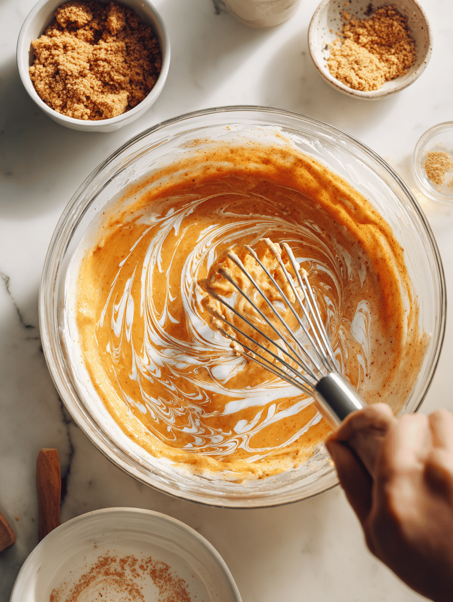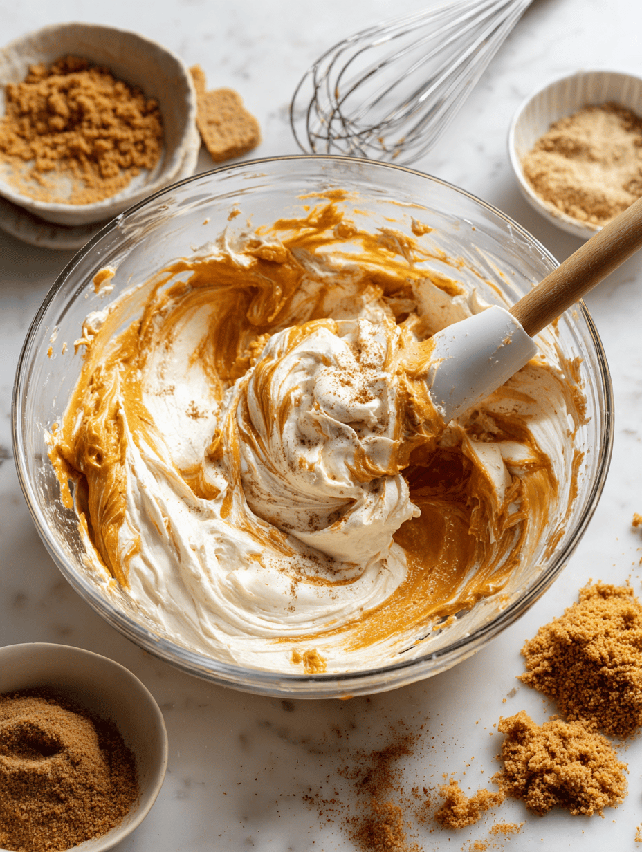 Add pumpkin purée and spices to the cream cheese mixture, folding gently with a spatula to combine evenly, releasing warm, spiced aroma.