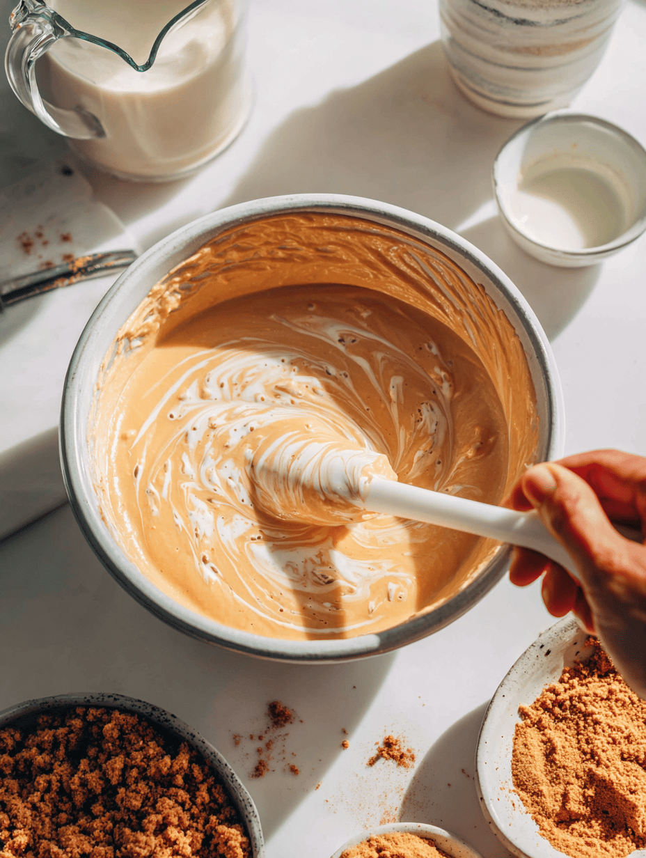 Pour in the heavy cream and stir gently until the filling is silky and uniform.