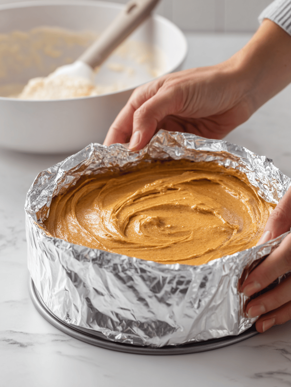 Wrap the outside of the springform pan with foil to prevent leaks. Pour the filling over the baked crust, smoothing the top with a spatula.