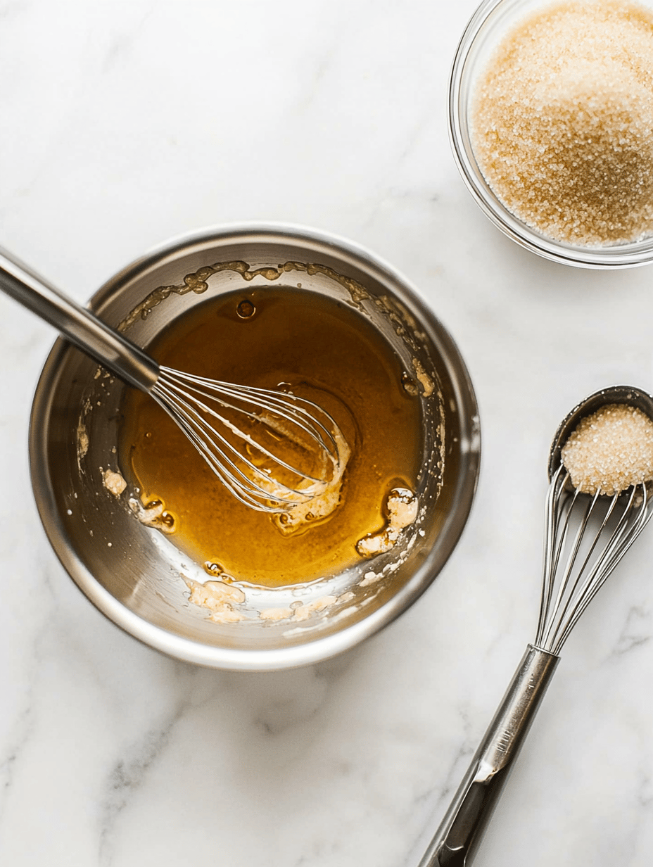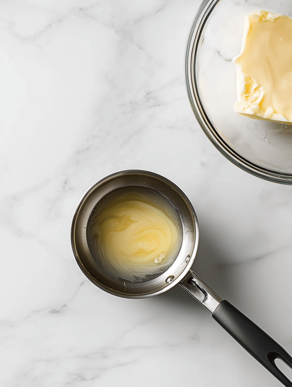 Start by melting the butter slowly in a saucepan over low heat, allowing it to brown slightly and develop a nutty aroma, then transfer it to a mixing bowl to cool slightly.