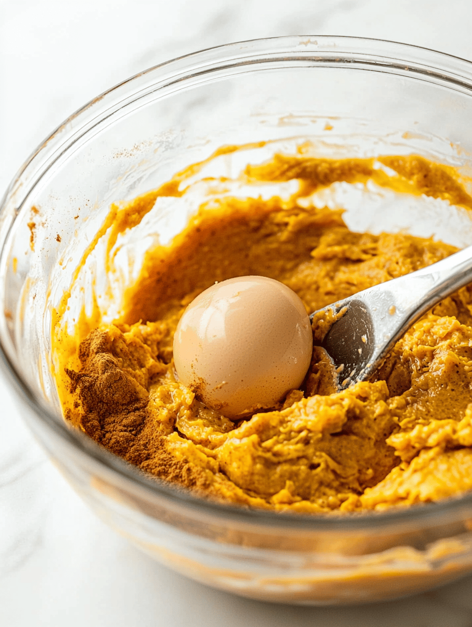 Stir in the pumpkin puree and a large egg, mixing until the mixture is thick, smooth, and fragrant.