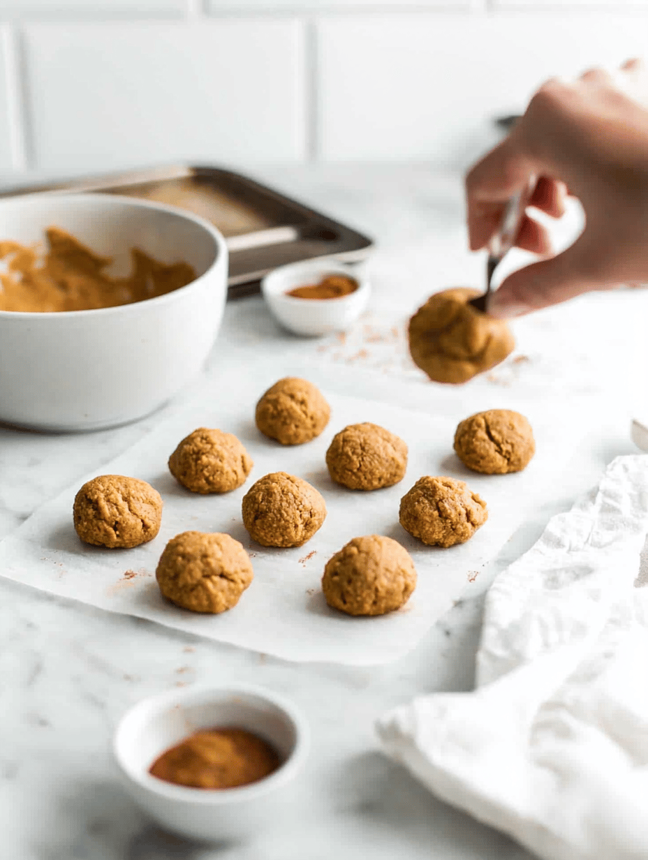 Using a tablespoon or cookie scoop, portion out the chilled dough and gently shape into balls, placing them onto the prepared baking sheet. Flatten slightly if desired.