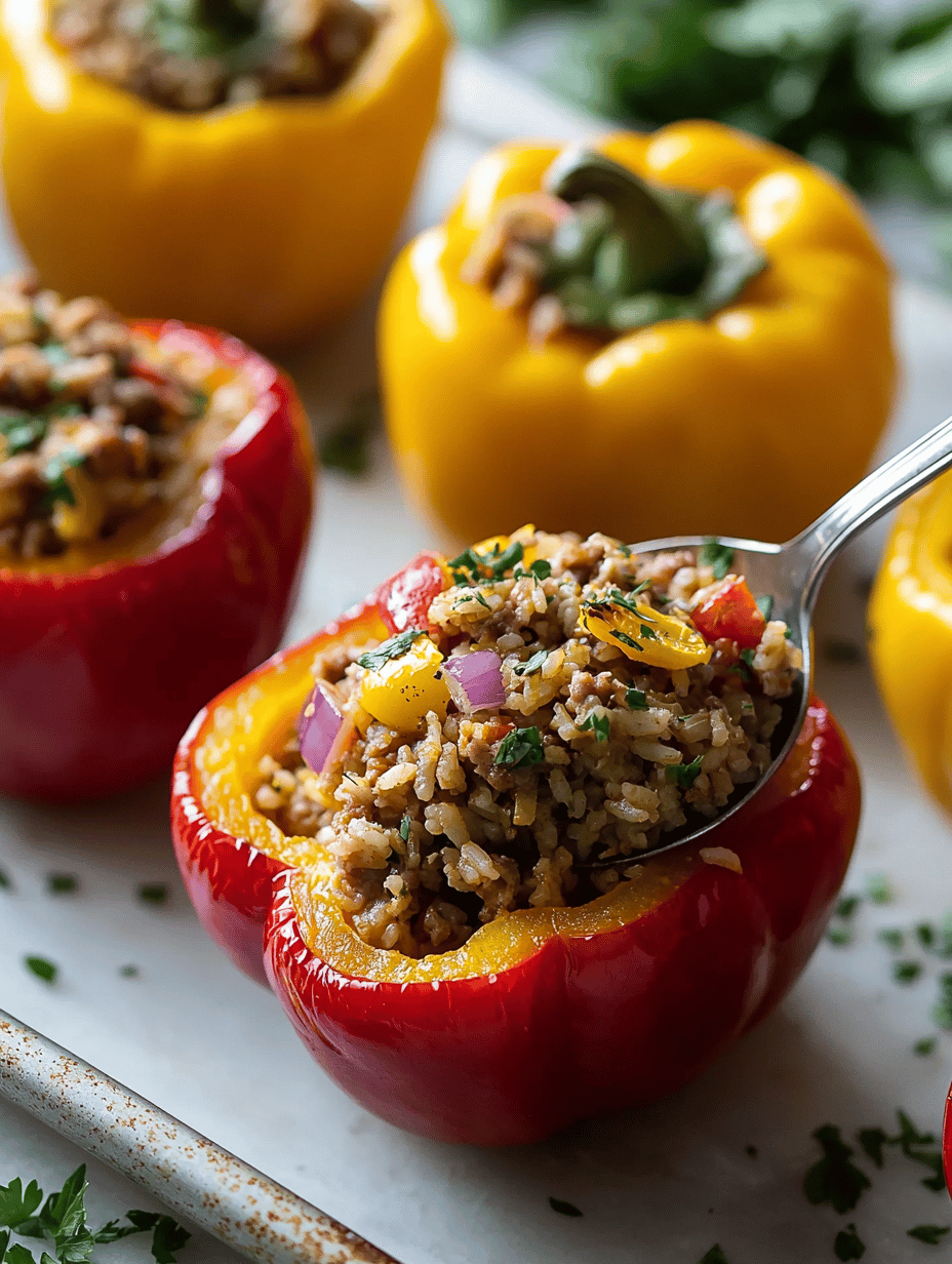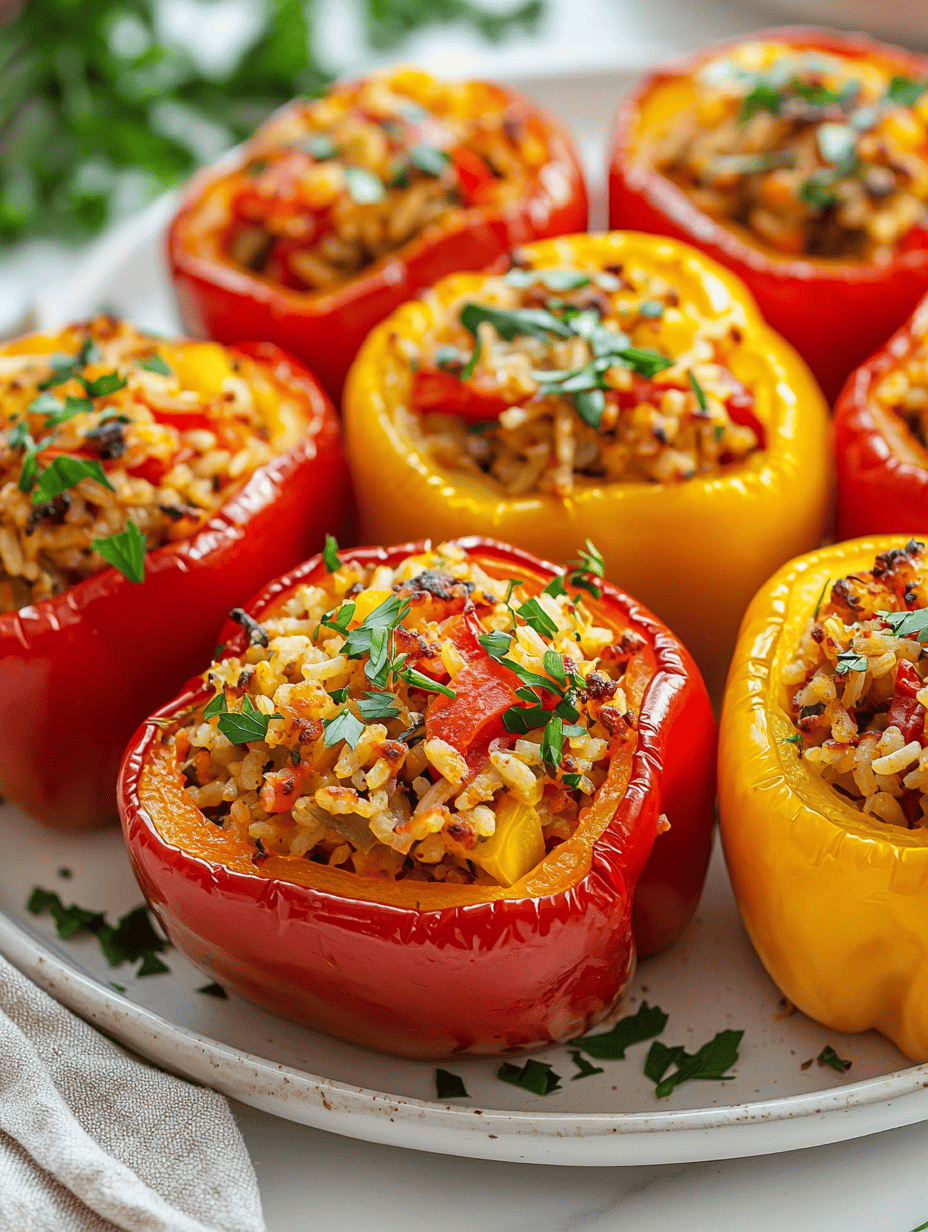 This dish features colorful bell peppers filled with a savory, spiced rice and vegetable mixture, then baked until tender and bubbling. The peppers are roasted to achieve a soft exterior, while the stuffing develops a rich flavor and slightly crispy top, creating a hearty, visually appealing presentation.