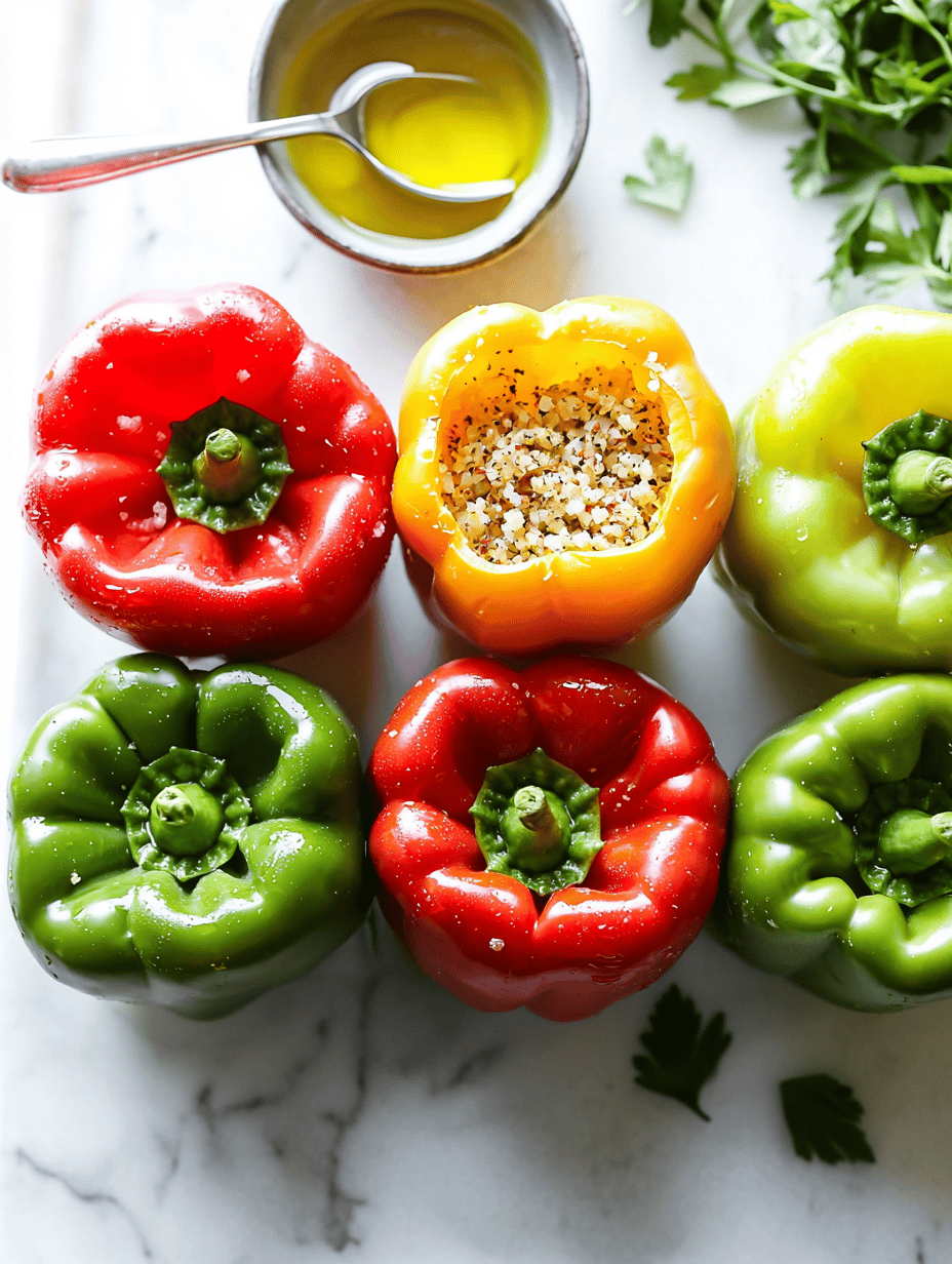 Preheat your oven to 375°F (190°C). Cut the tops off the peppers and remove the seeds and membranes, then place them upright on a baking sheet. Drizzle lightly with a teaspoon of olive oil and set aside.