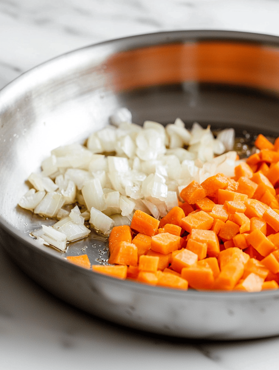 Heat a skillet over medium heat with a tablespoon of olive oil. Sauté the chopped onion and diced carrot until they soften and become fragrant, about 5 minutes.