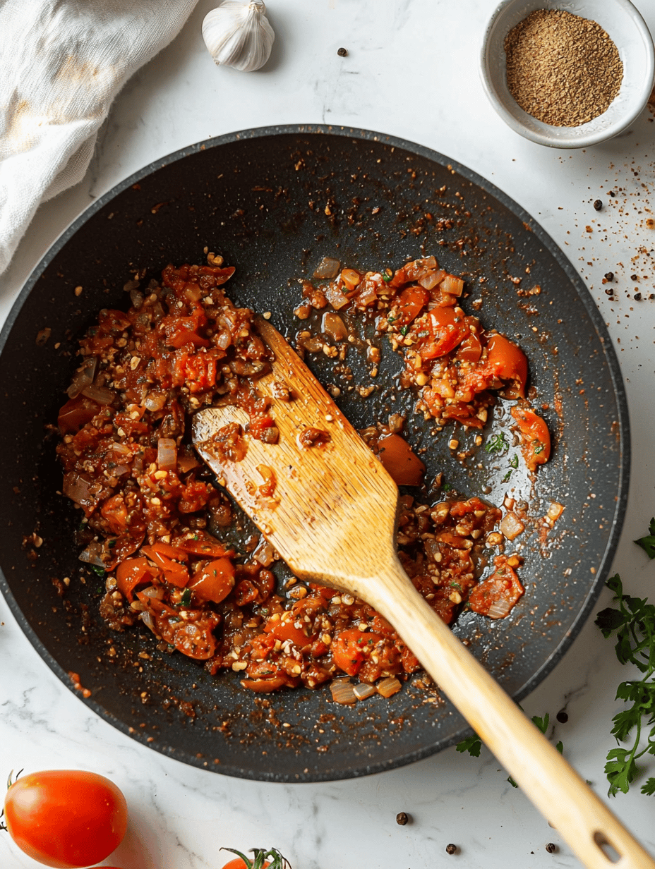 Add the minced garlic, cinnamon, and cumin to the skillet, cooking for another minute until fragrant. Mix in the drained tomatoes and cook for a few minutes until heated through and slightly thickened.