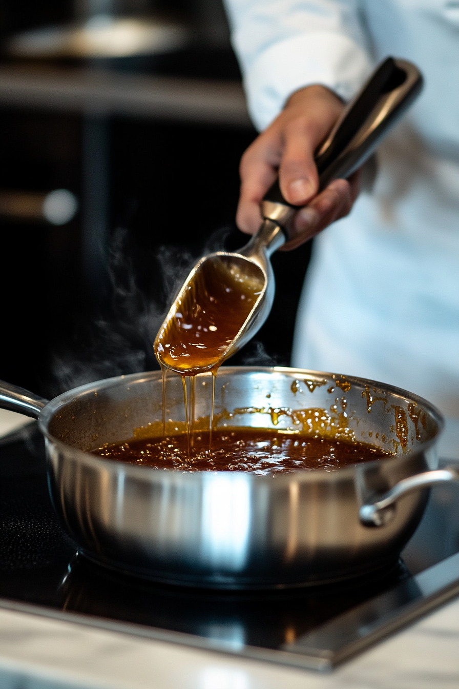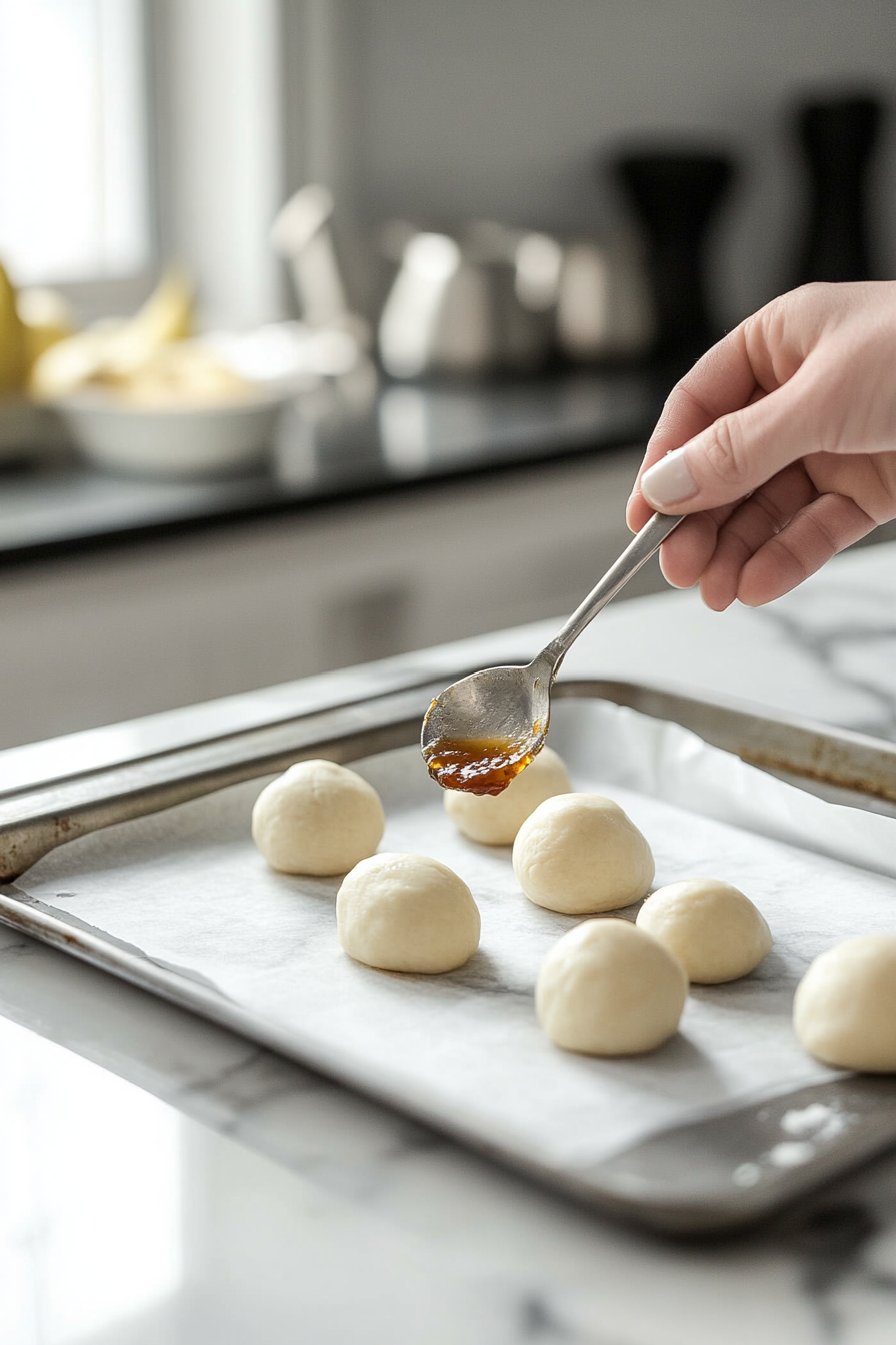 Fill with Pear Preserves: Scoop 4 oz. dough balls, make a well, add a teaspoon of pear preserves, pinch to seal, and place on the baking sheet.